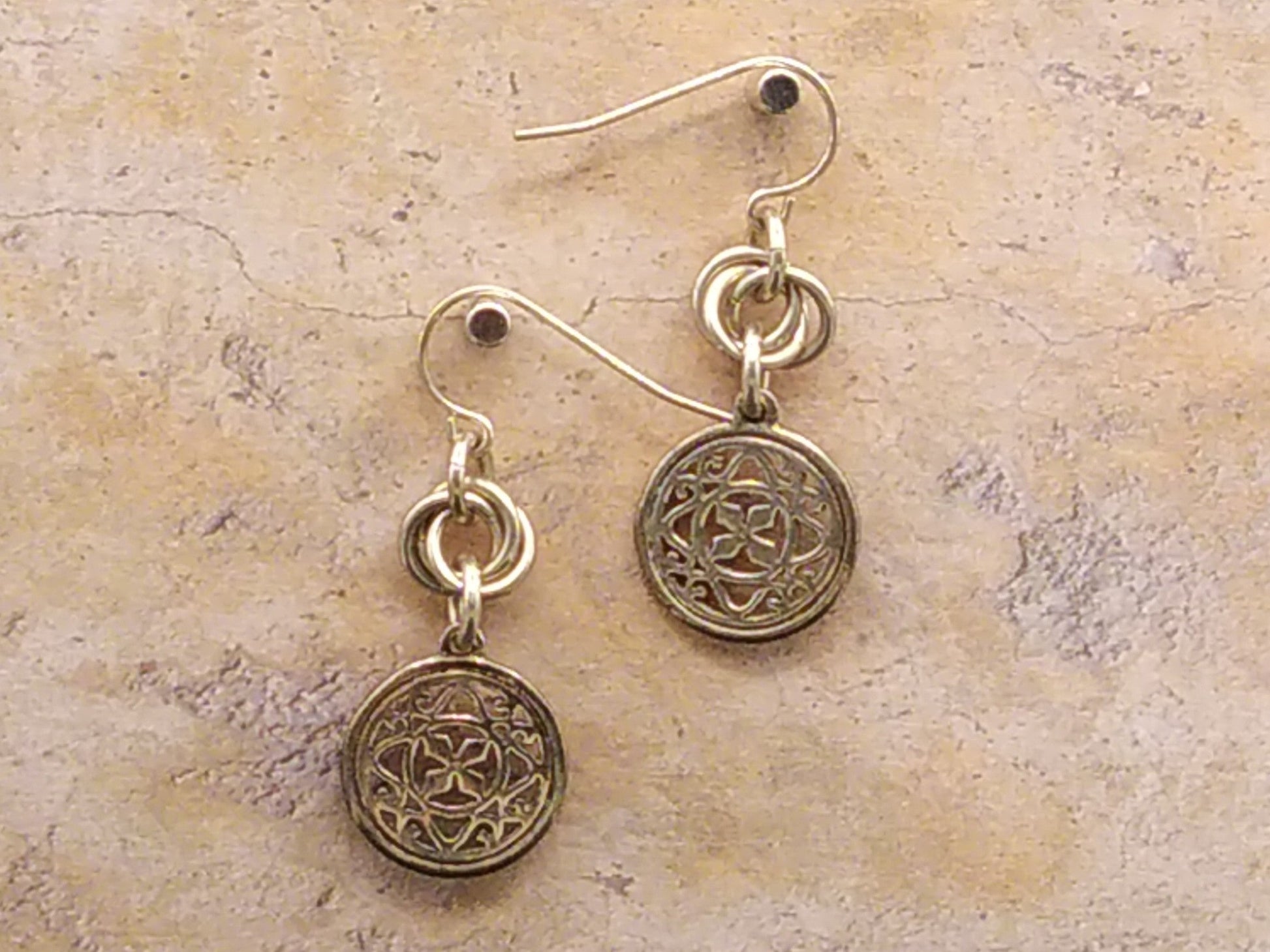 Een set zilvergekleurde metalen oorbellen met titanium oorbelhaakjes. De hangers aan de oorbellen zijn uitgesneden tot een soort mozaiek.