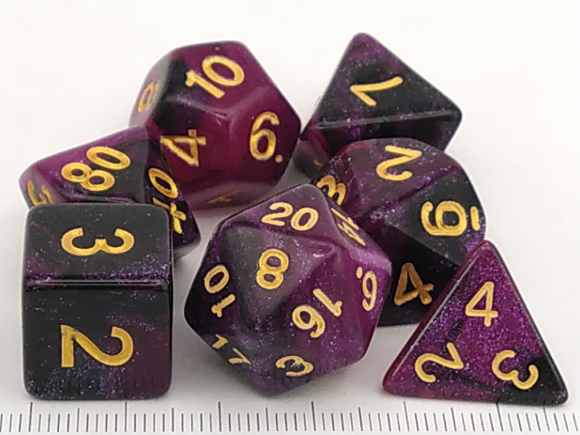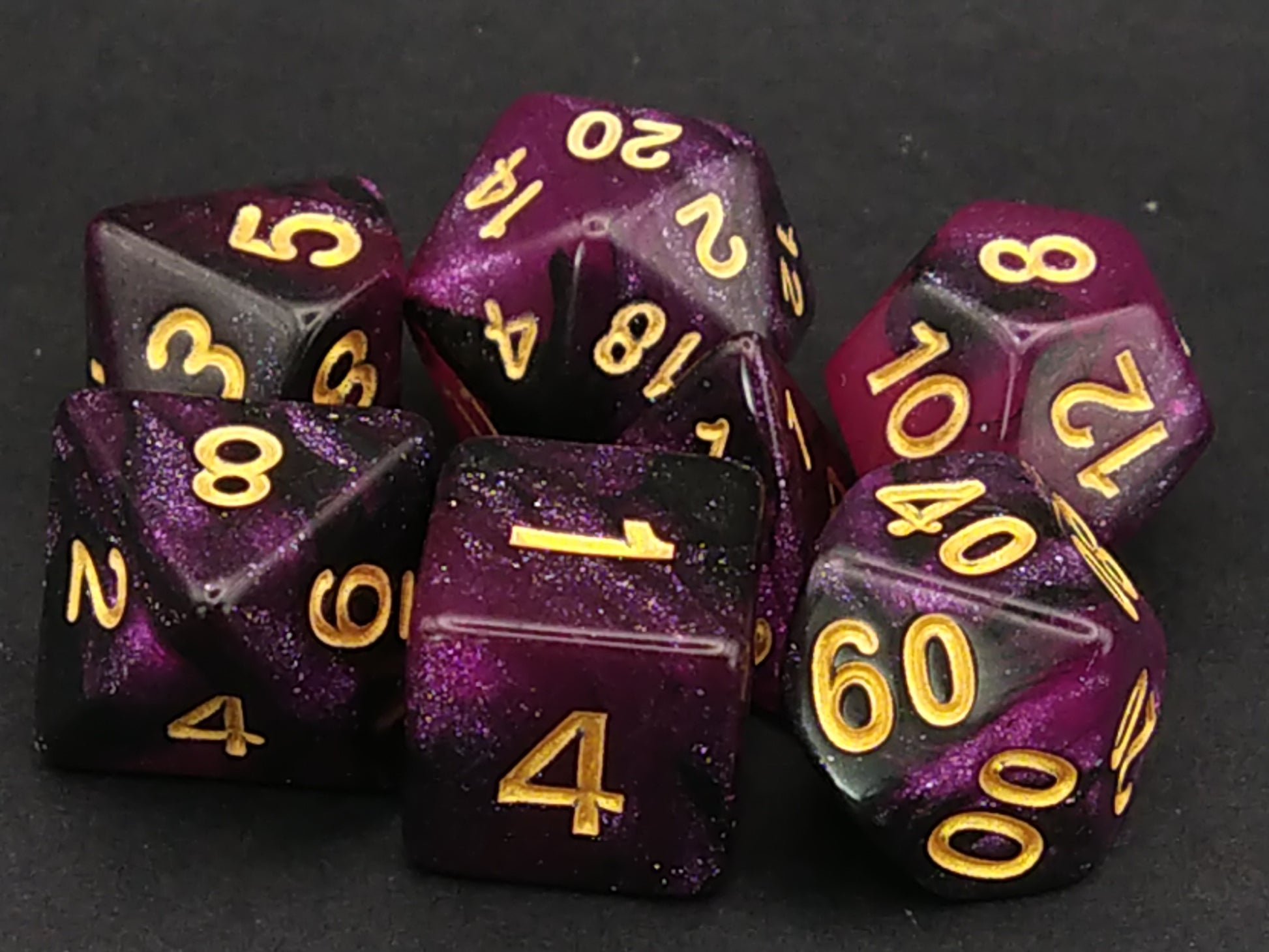 Een set polydice, halfdoorschijnend paars-zwart met glitter. De set heeft goudkleurige cijfers.