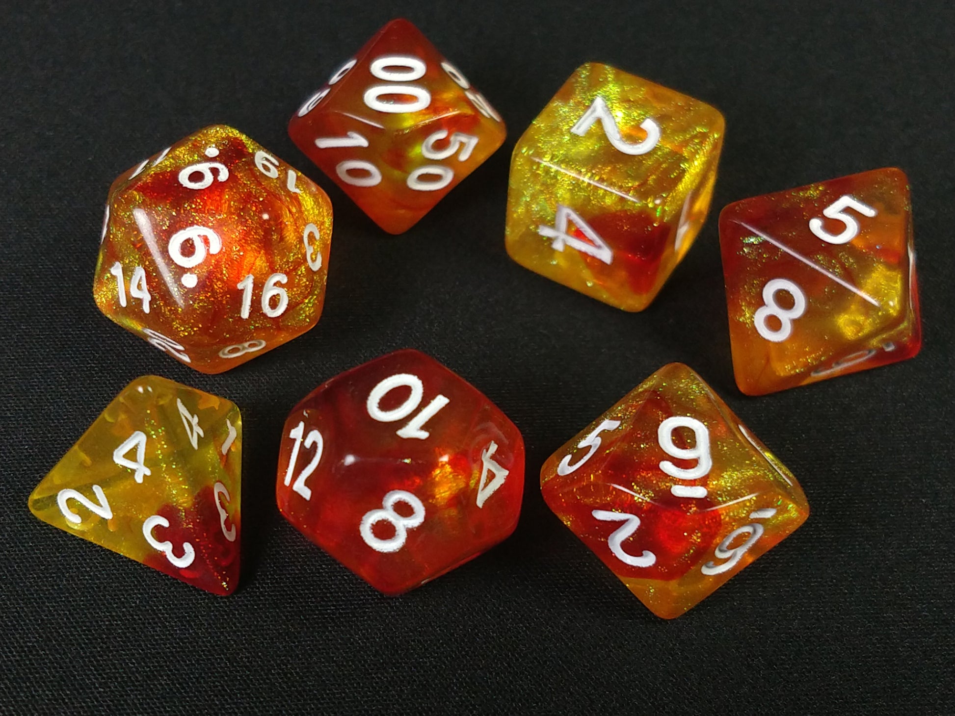 Een set polydice, halfdoorschijnend oranje-rood met kleurwisselde glitters groen-geel-oranje, met witte cijfers.
