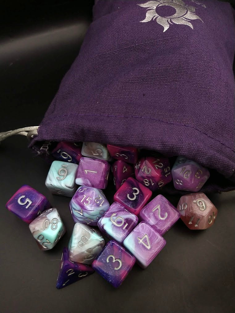 Een buidel vol losse Eclipse Starstruck dobbelstenen in drie kleuren met een gewicht van ongeveer 500 gram.Â