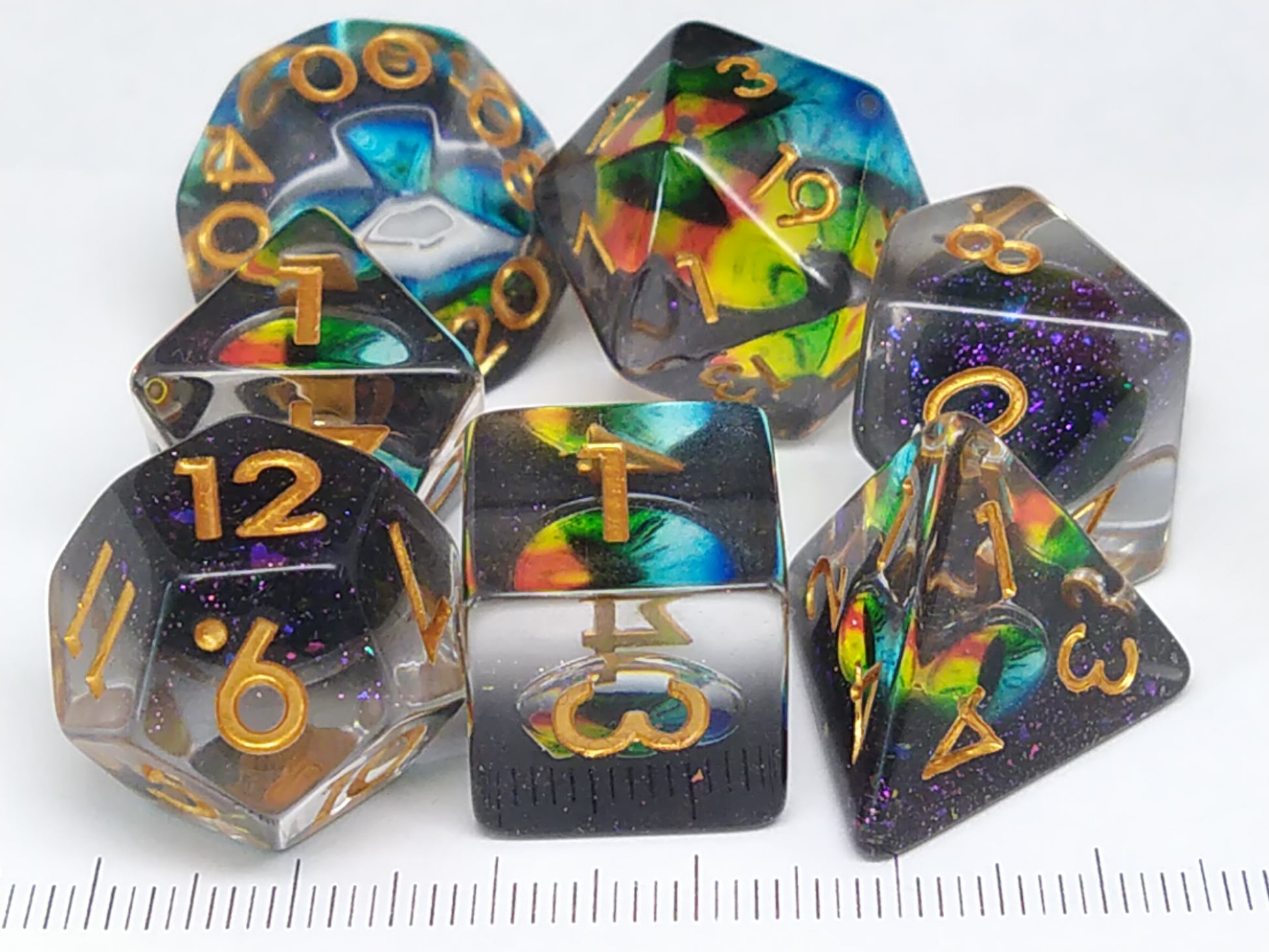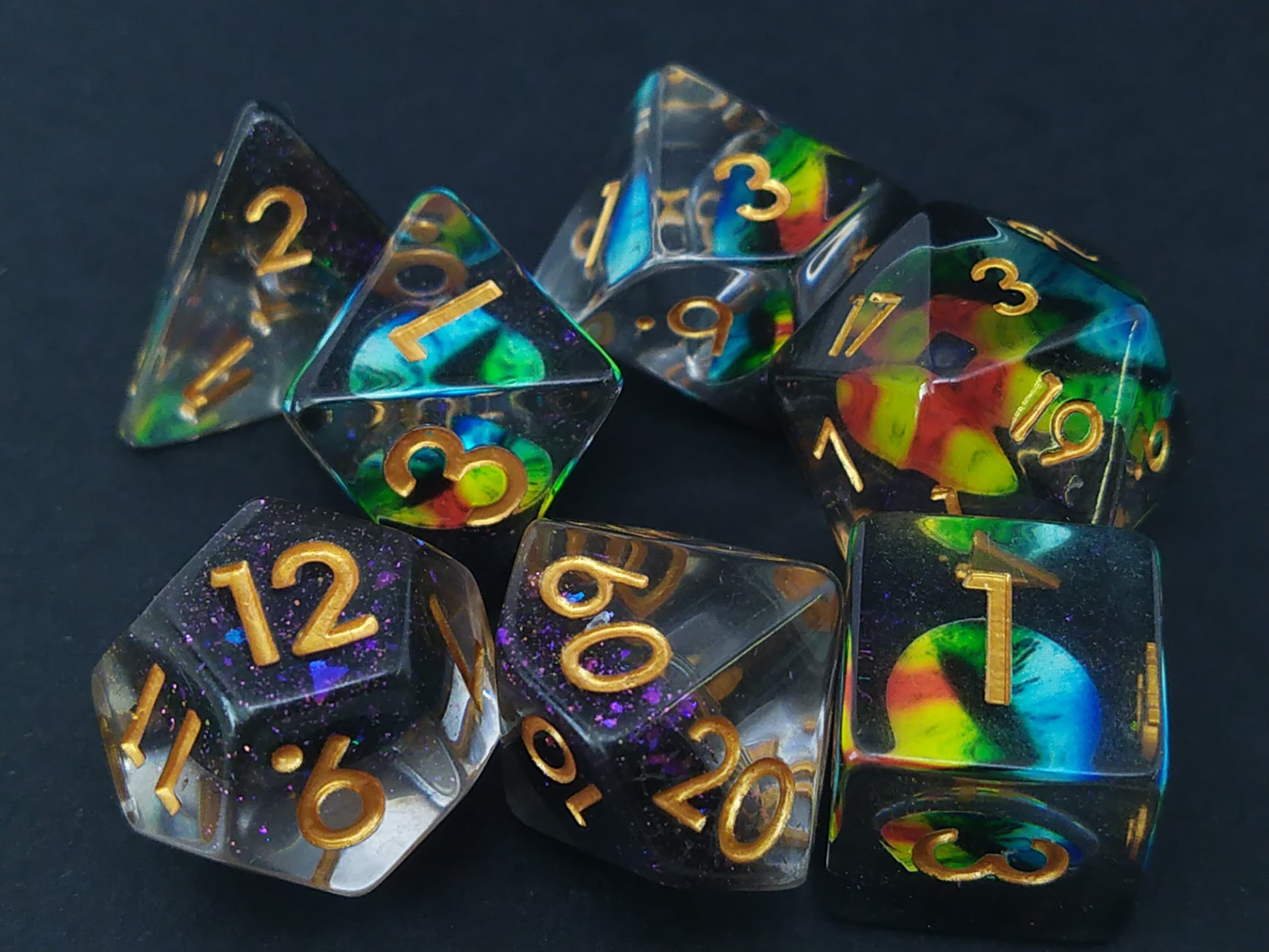 Een set kleurloze en zwarte transparante polydice met een meerkleurig oog en witte cijfers.