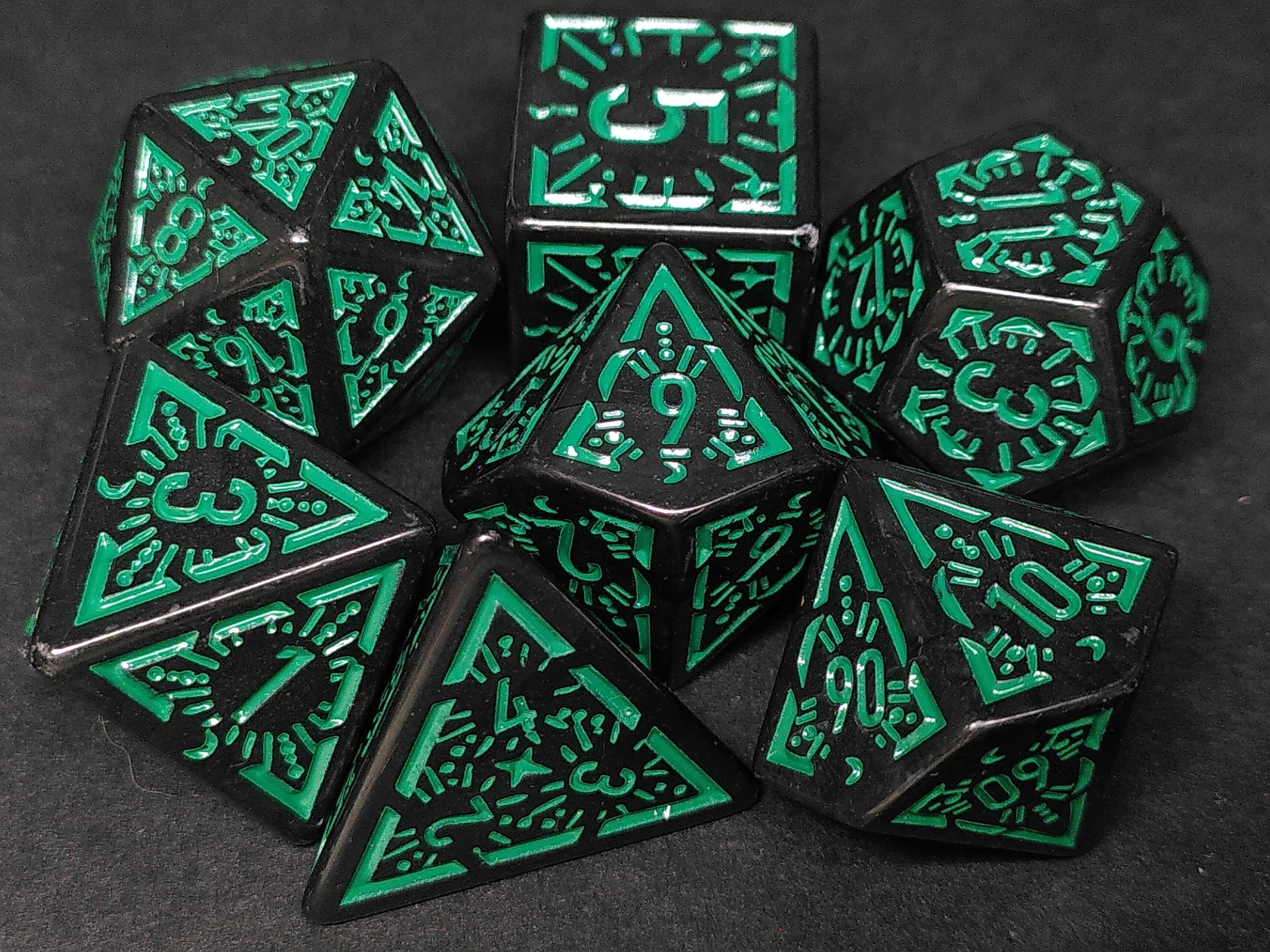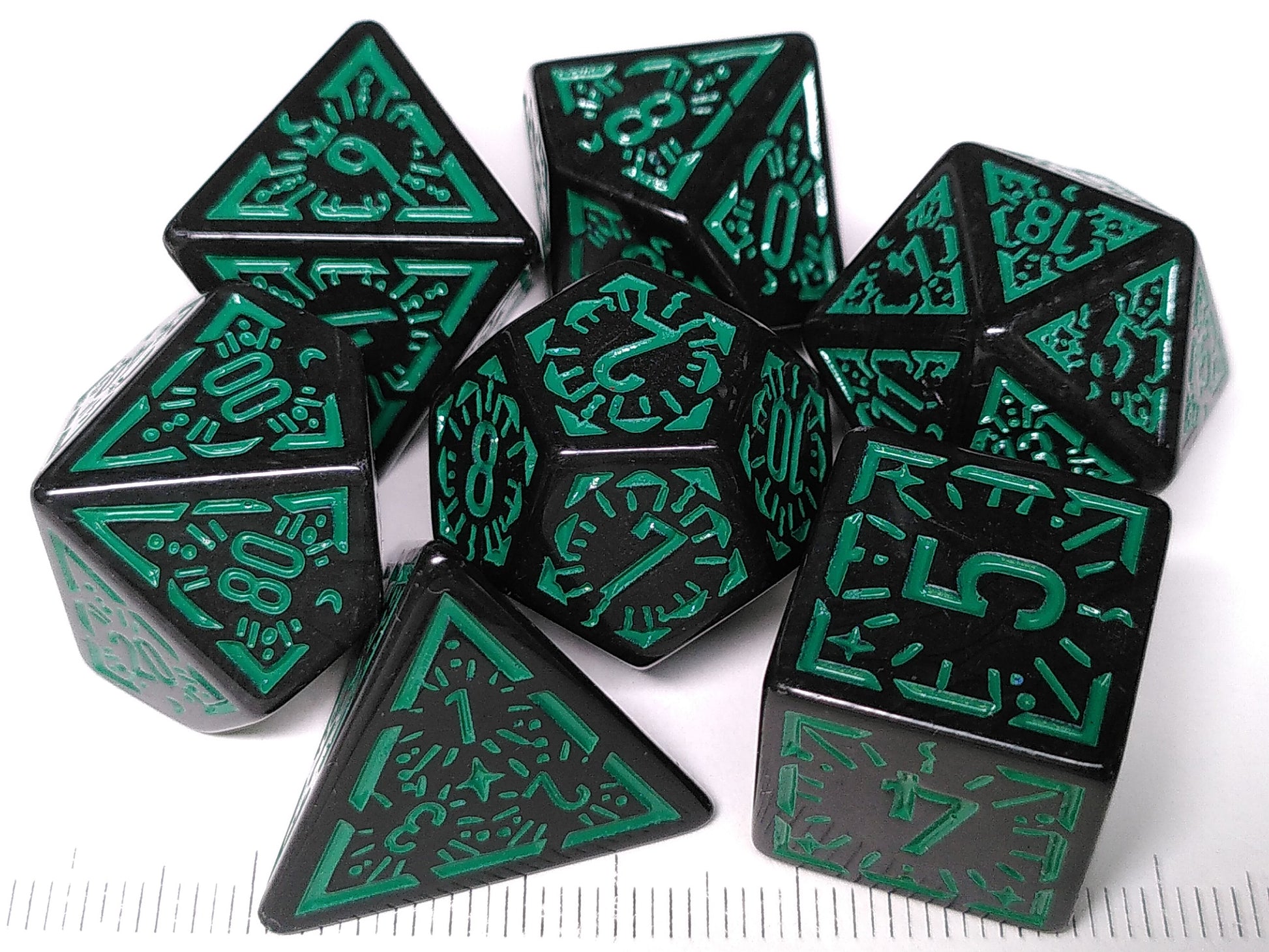 Een set van zeven dobbelstenen, zwart van kleur met in het blauw-groen gegraveerde vlakken.