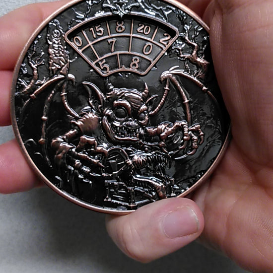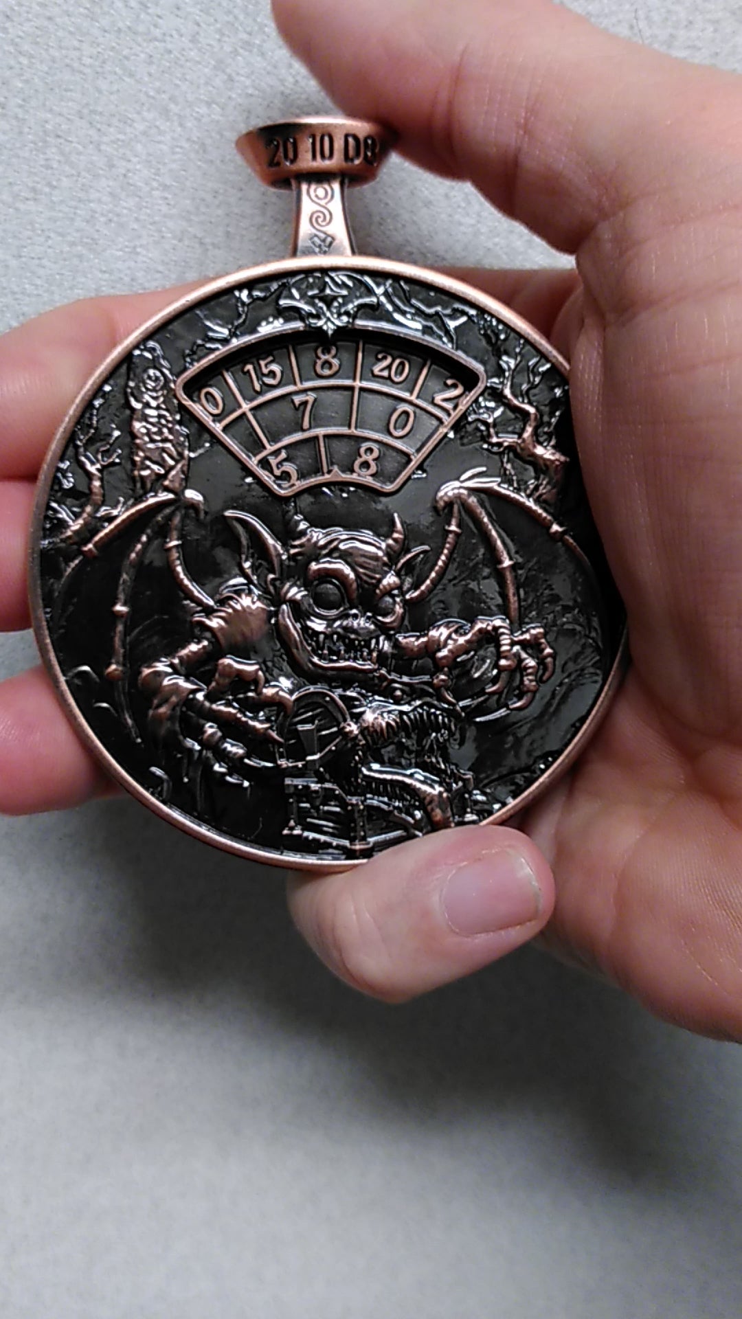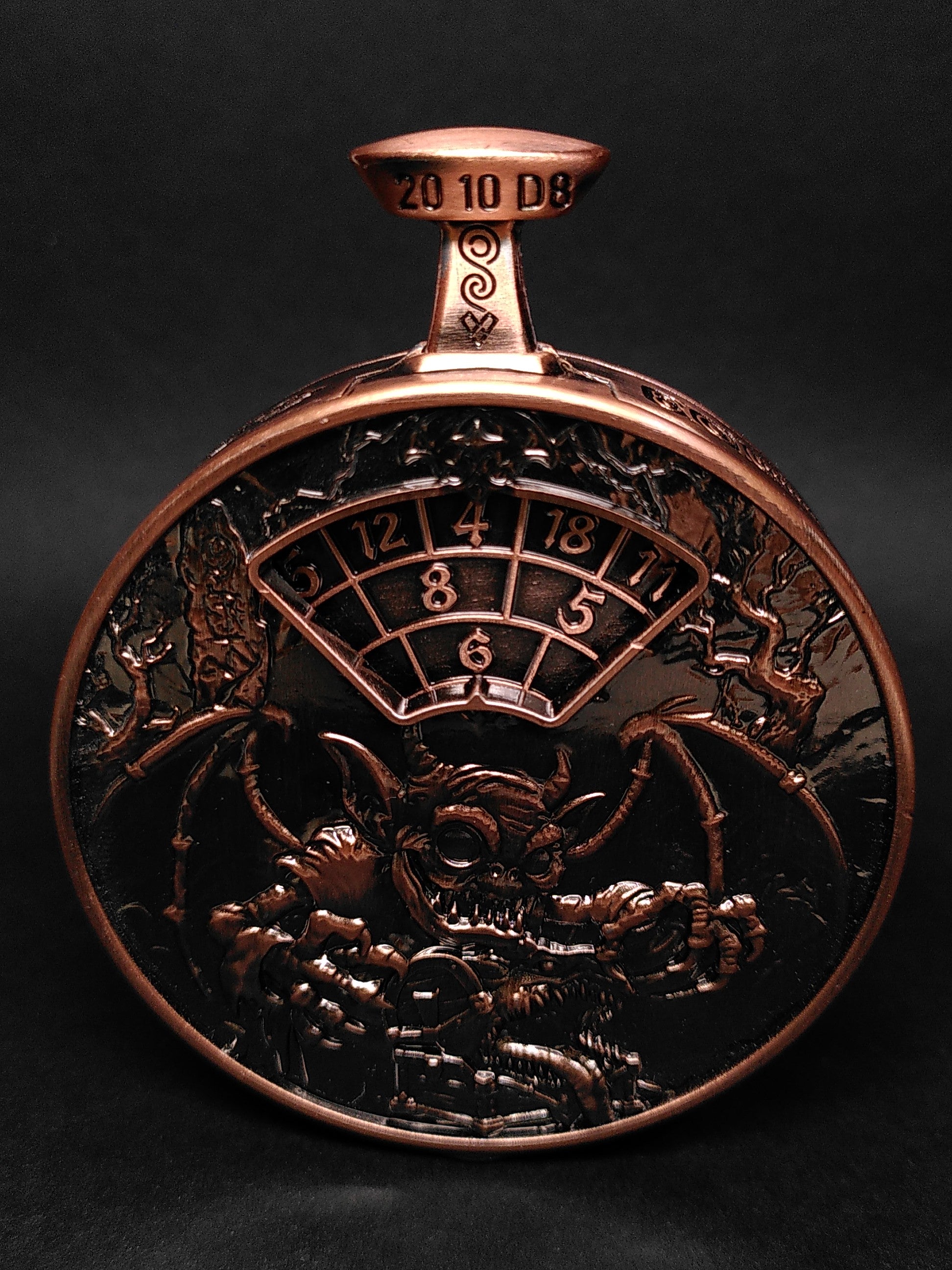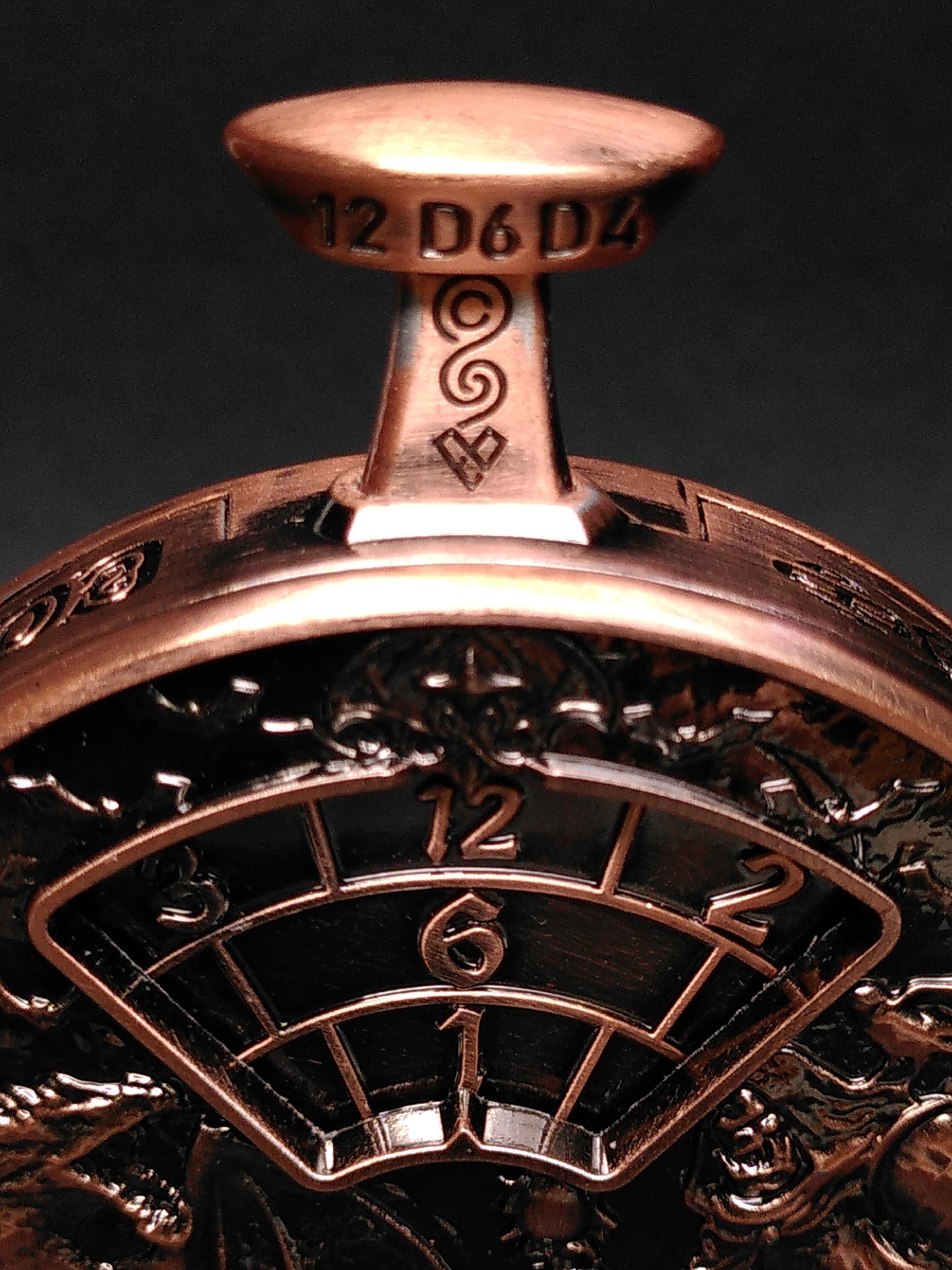 Een metalen spinner gevormd als een stevig formaat zakhorloge. Een druk op de knop zet de cijferplaat aan het draaien, die stopt zodra je de knop loslaat. De behuizing is versierd met diverse klassieke monsters uit fantasy rollenspellen.