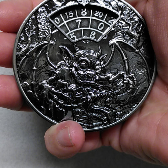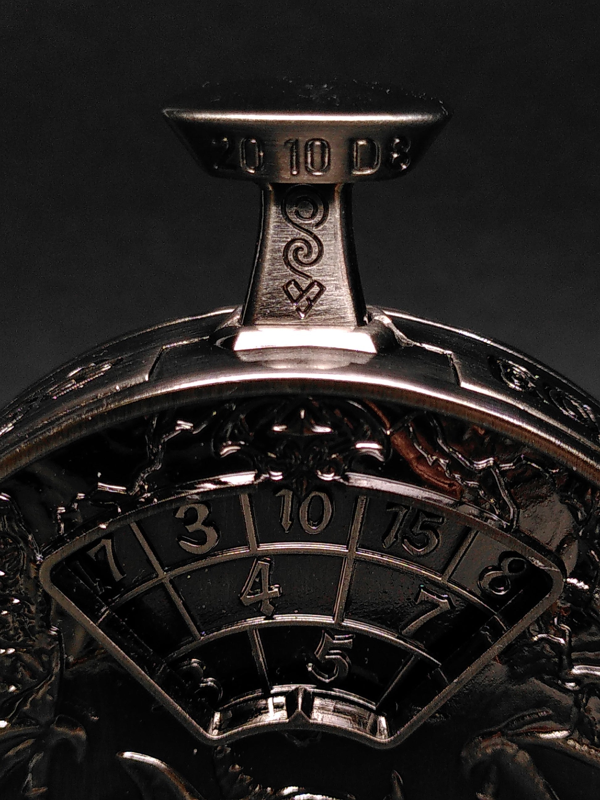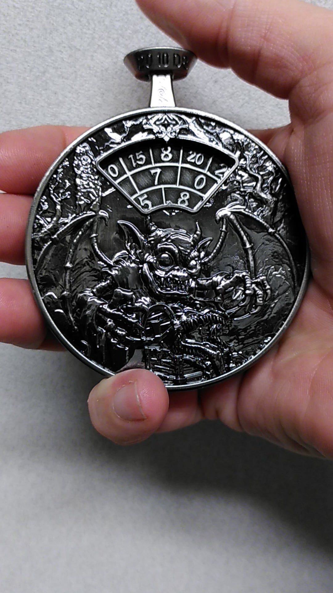 Een metalen spinner gevormd als een stevig formaat zakhorloge. Een druk op de knop zet de cijferplaat aan het draaien, die stopt zodra je de knop loslaat. De behuizing is versierd met diverse klassieke monsters uit fantasy rollenspellen.