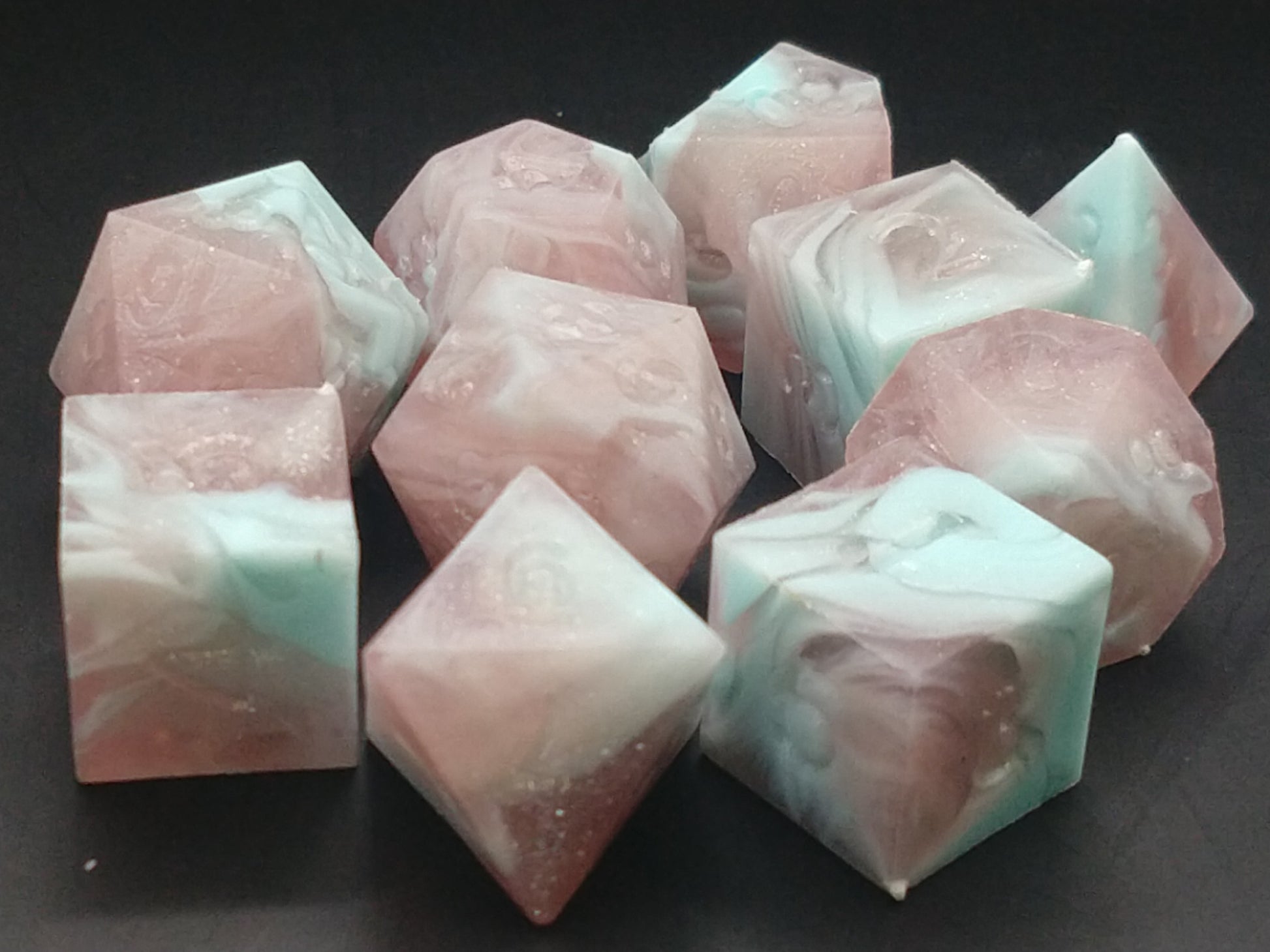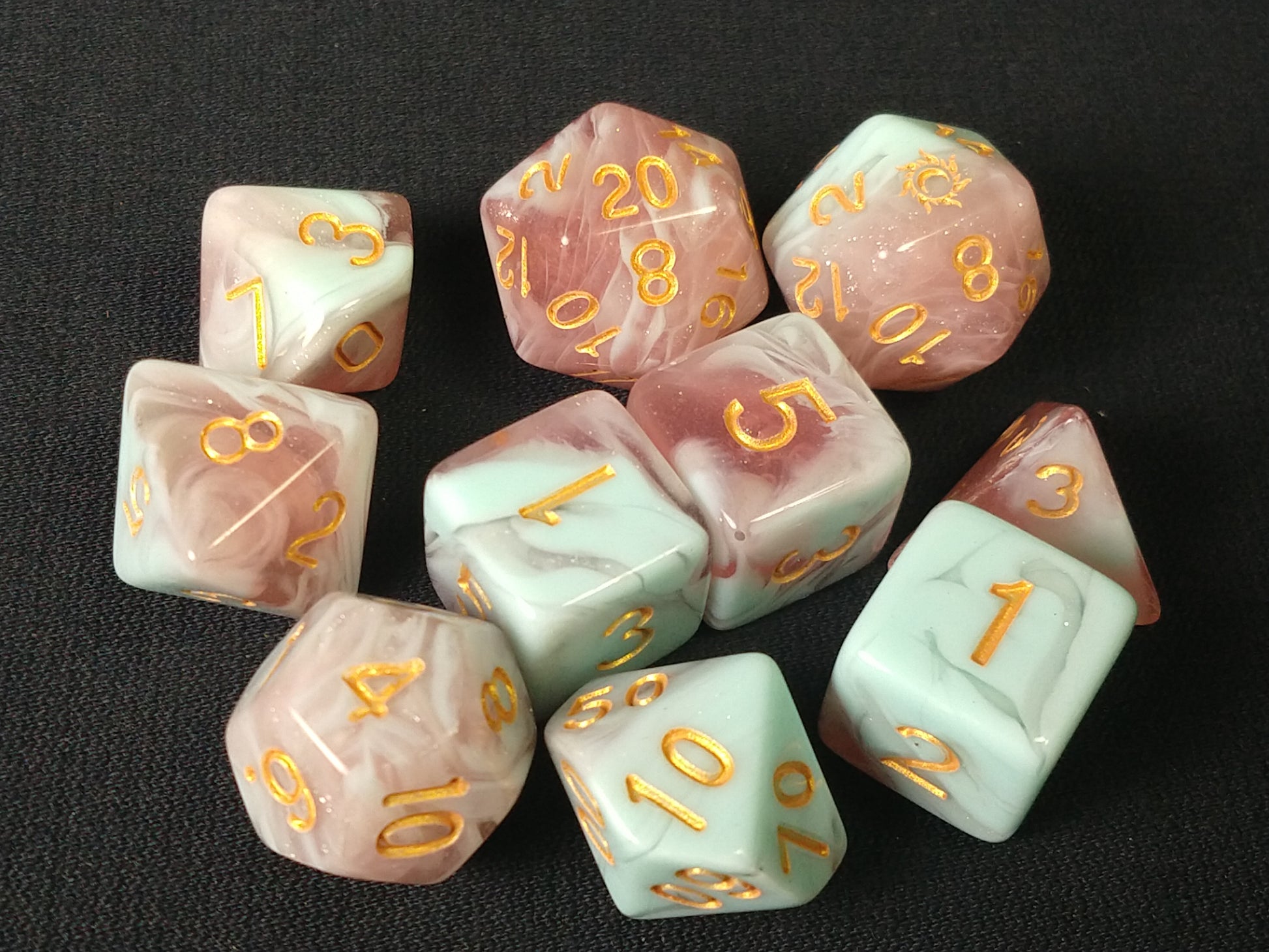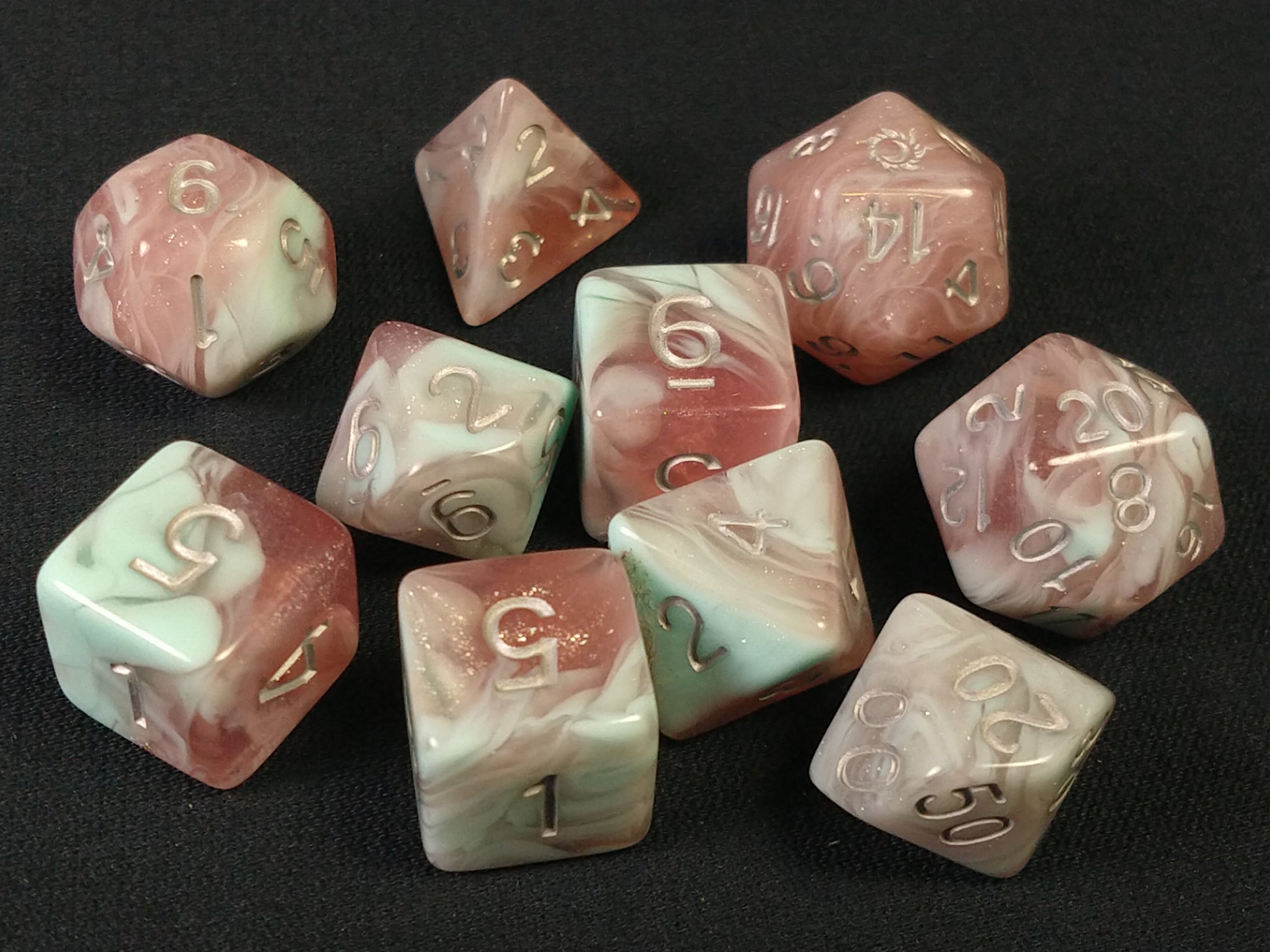 Pure Heart is a mint, with salmon pink translucent swirl dice set. Available in gold, silver and white ink options, as well as a raw (uninked and unpolished) set.
