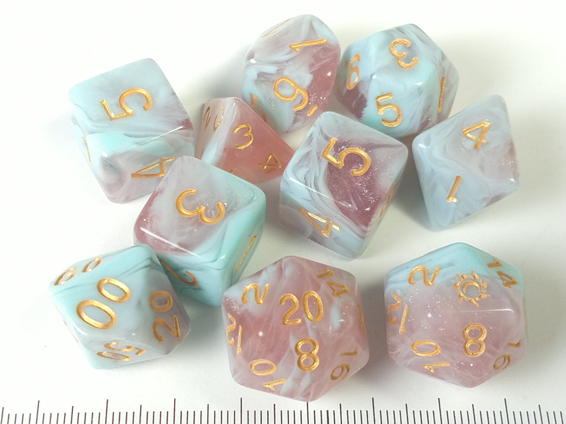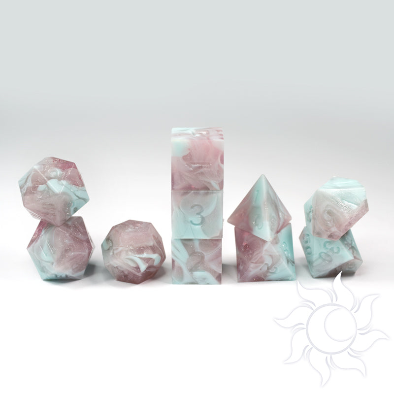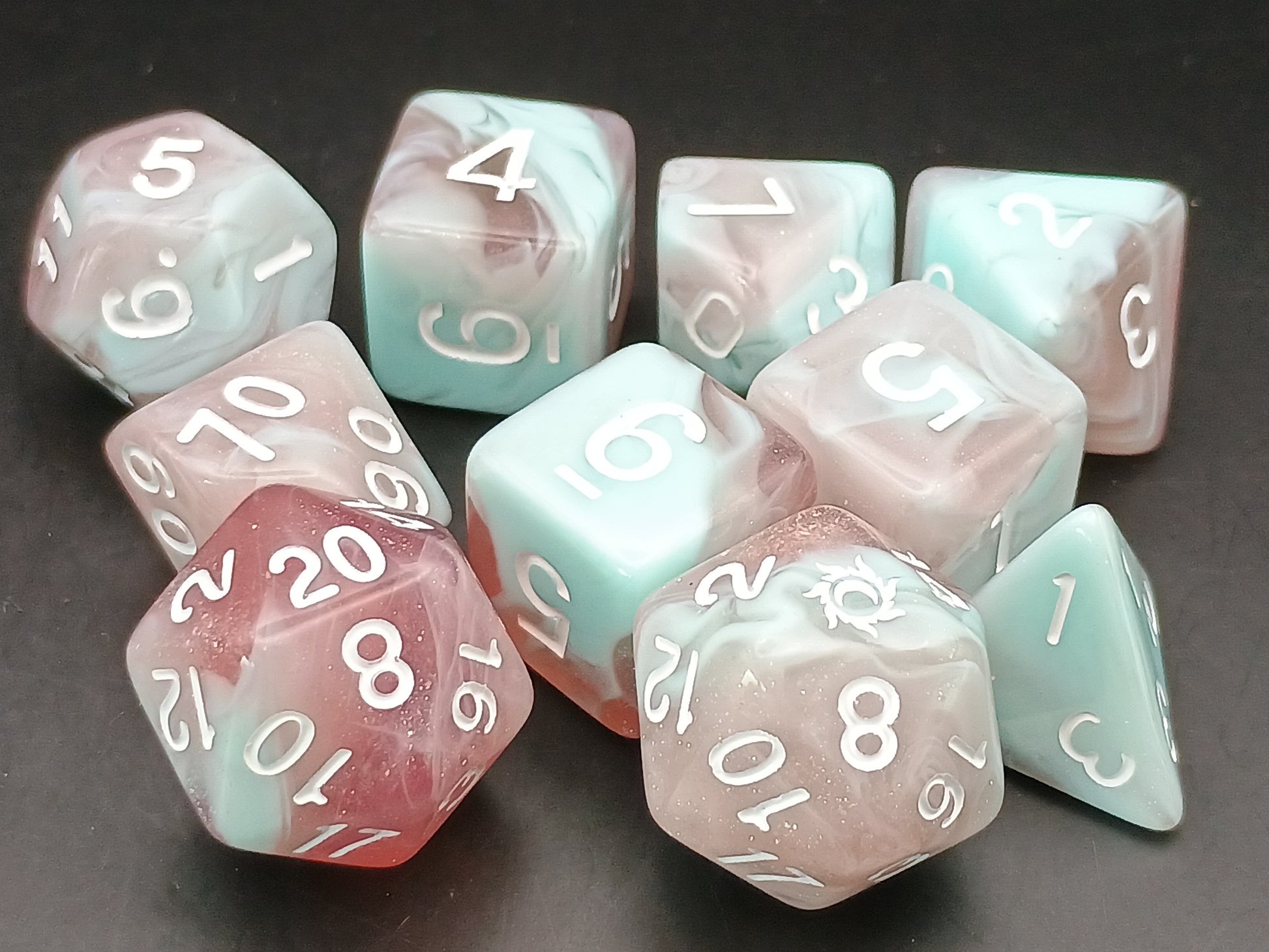 Pure Heart is a mint, with salmon pink translucent swirl dice set. Available in gold, silver and white ink options, as well as a raw (uninked and unpolished) set.