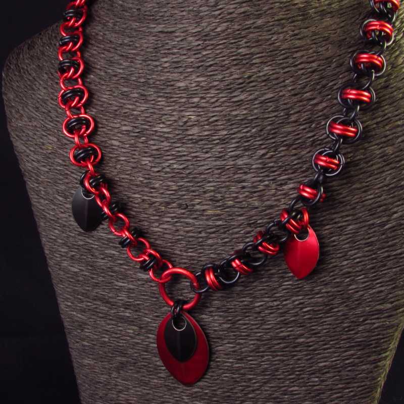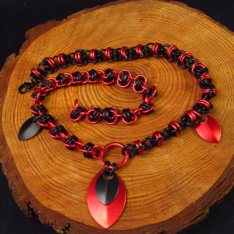 Een ketting gemaakt met gekleurde aluminium ringen en gekleurde aluminium schubben. De ketting is afwisselend rood en zwart en heeft een zwartkleurige roestvrijstalen karabijnhaak als sluiting.