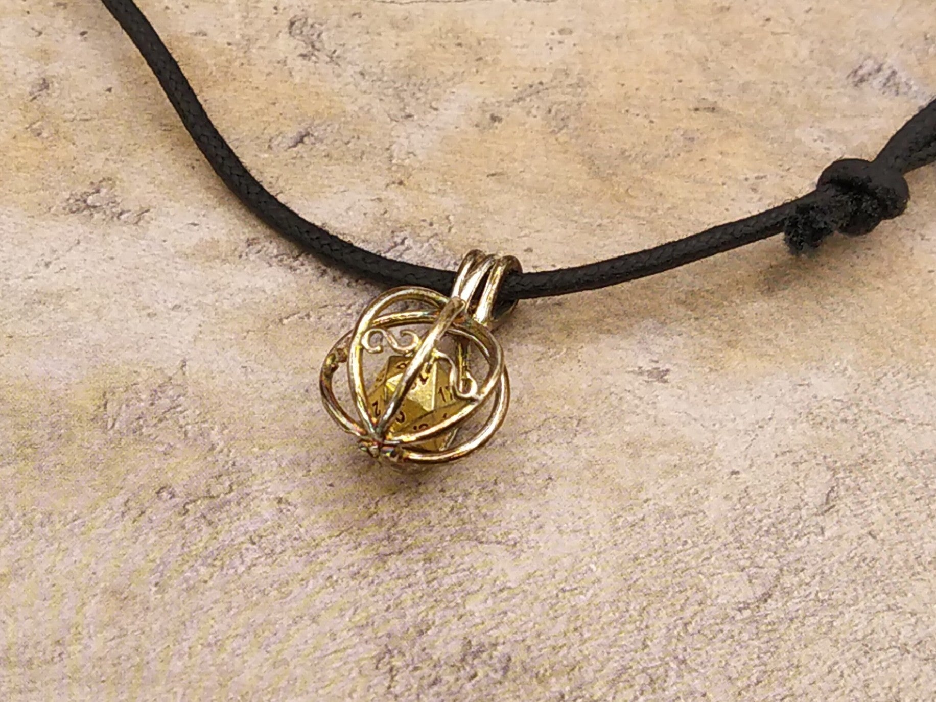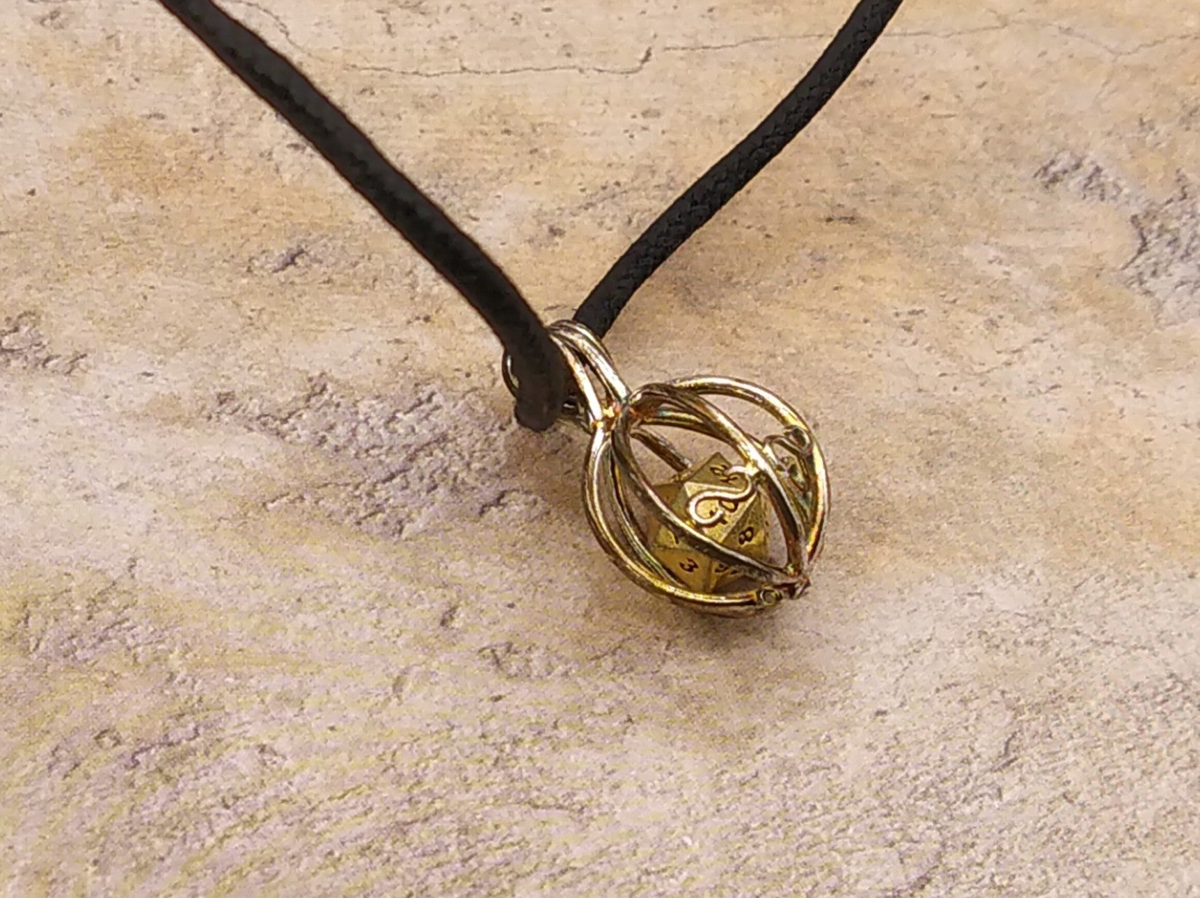 Een zeer kleine kooiconstructie met daarin een micro dobbelsteen, de kooi kan open en de dobbelsteen kan worden verwisseld met iets anders. De hanger komt met een gewaxt katoenen koord.
