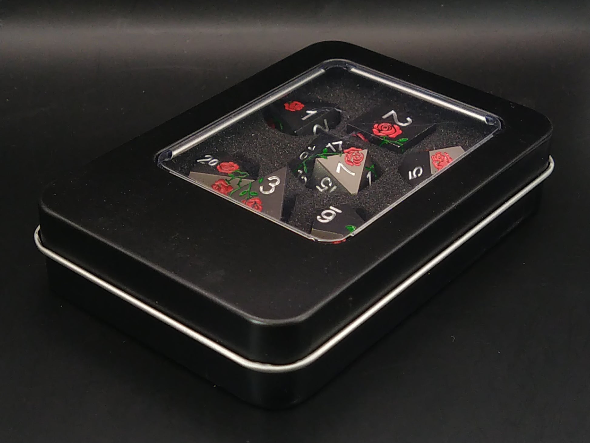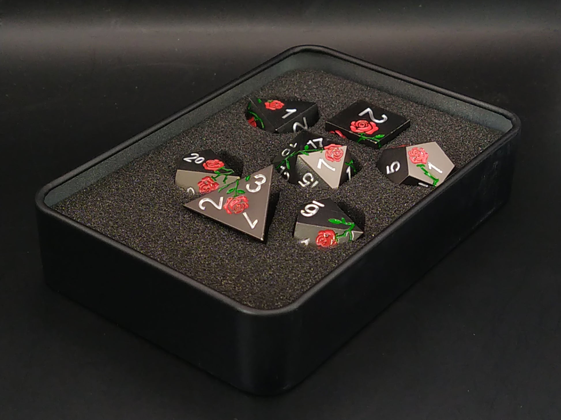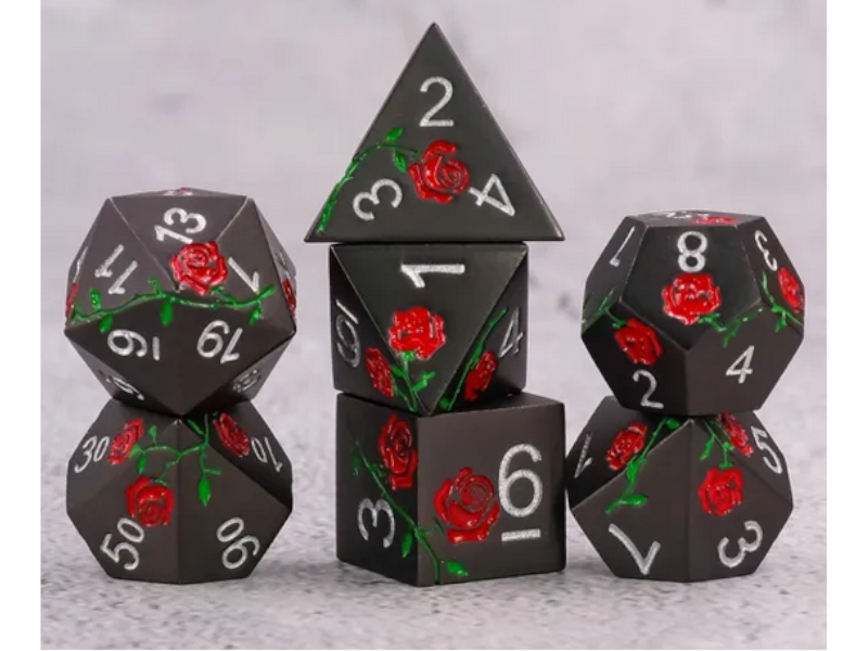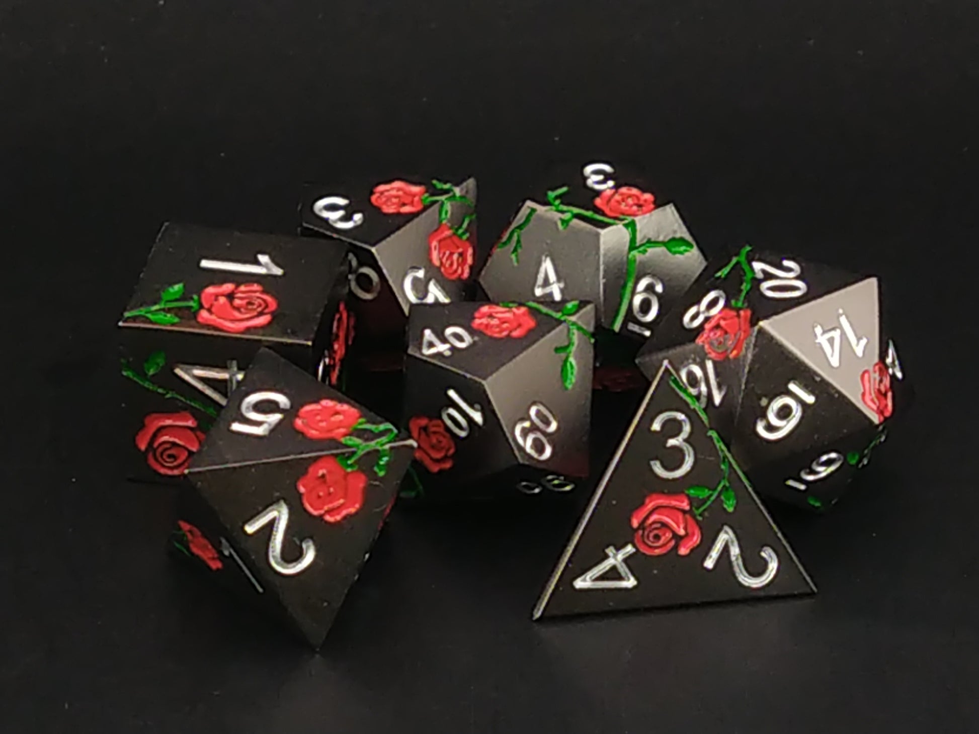 Een set van 7 mat zwarte metalen polydice met gegraveerde rozen die rood zijn gekleurd, de set heeft witte cijfers.
