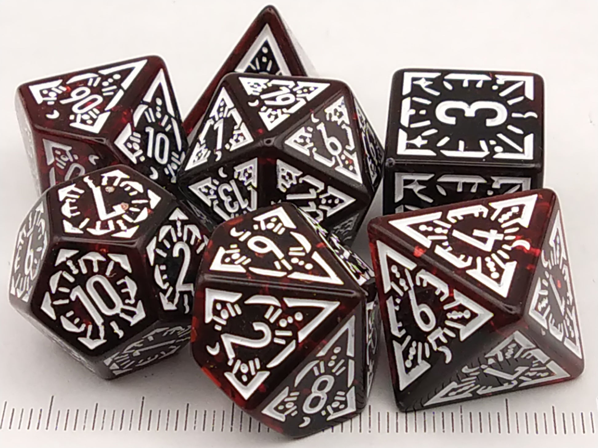 Een set van zeven dobbelstenen, transparant donkerrood met in het wit gegraveerde vlakken.