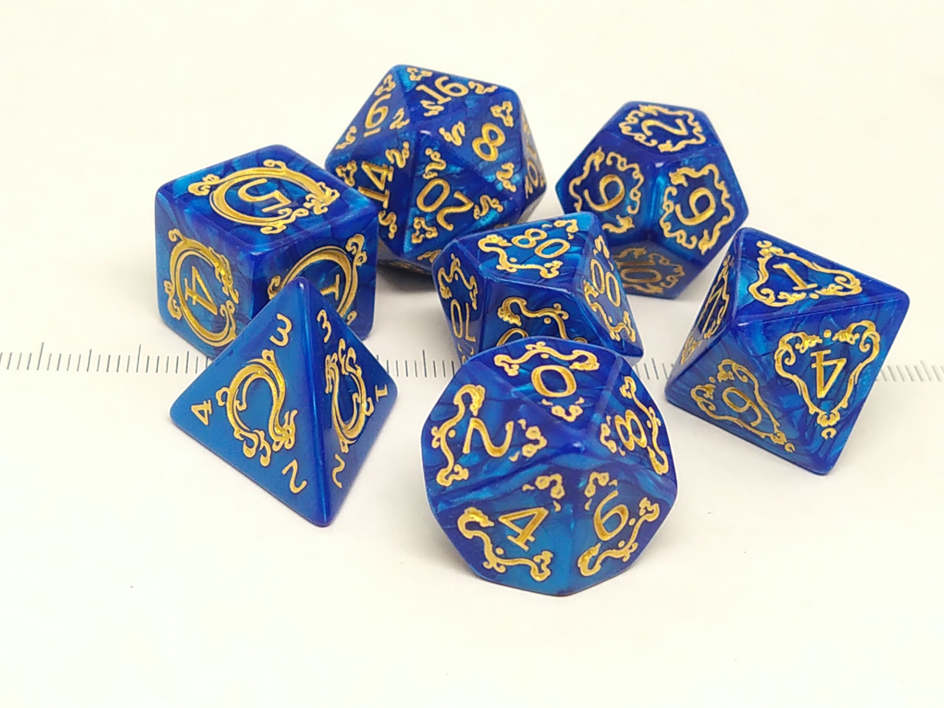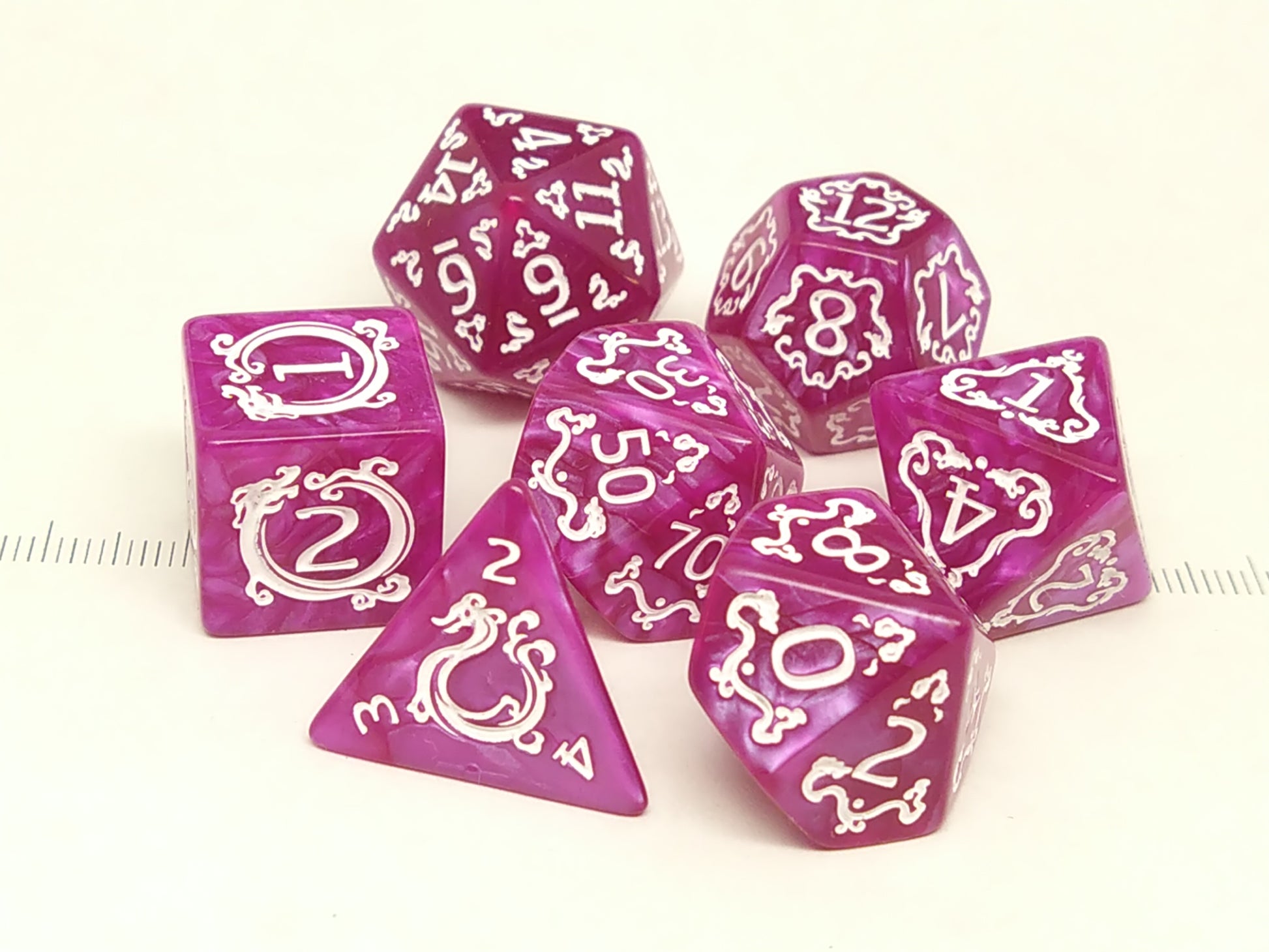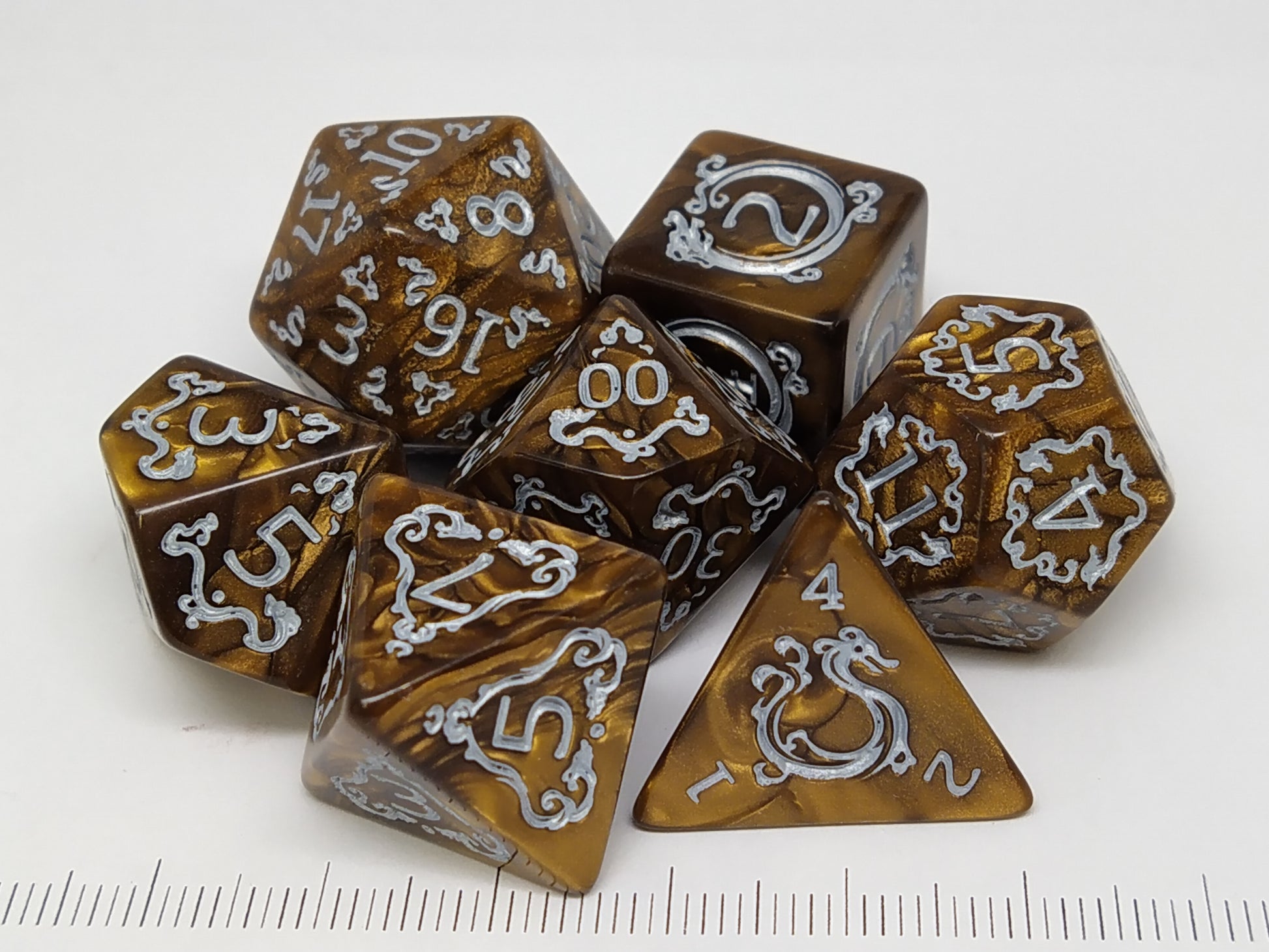 Een set van zeven iriserende dobbelstenen met een draak of slangen thema.