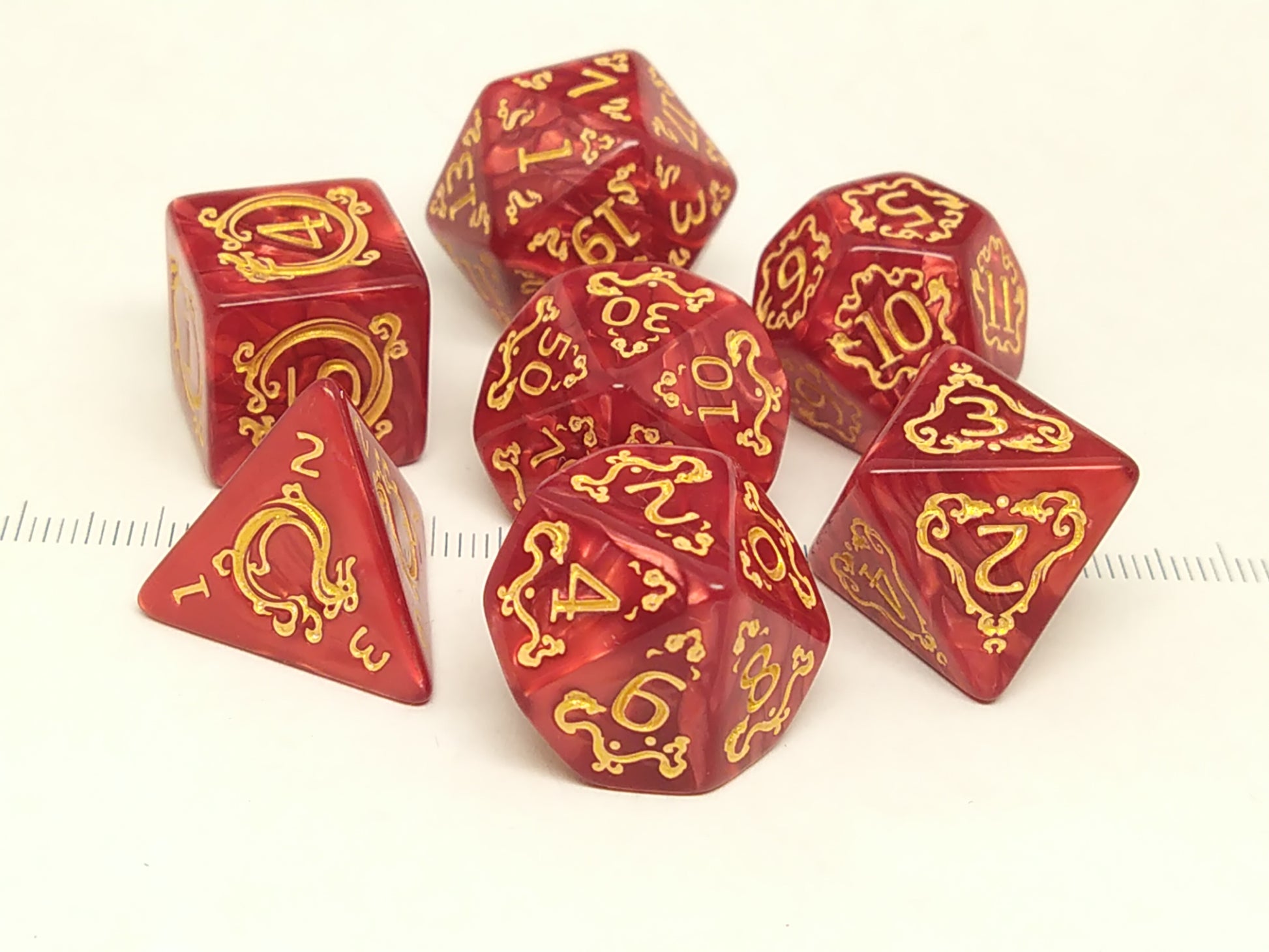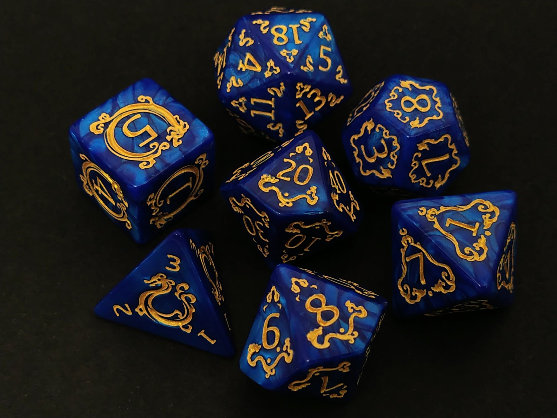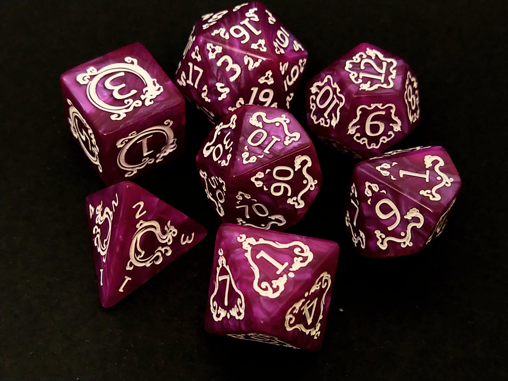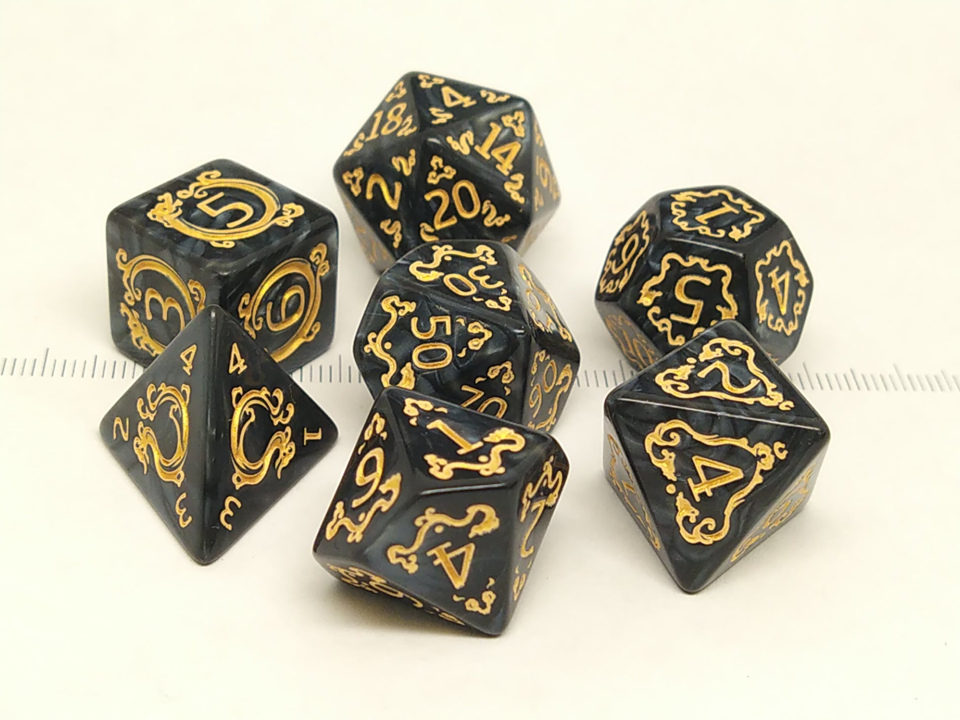 Een set van zeven iriserende dobbelstenen met een draak of slangen thema.