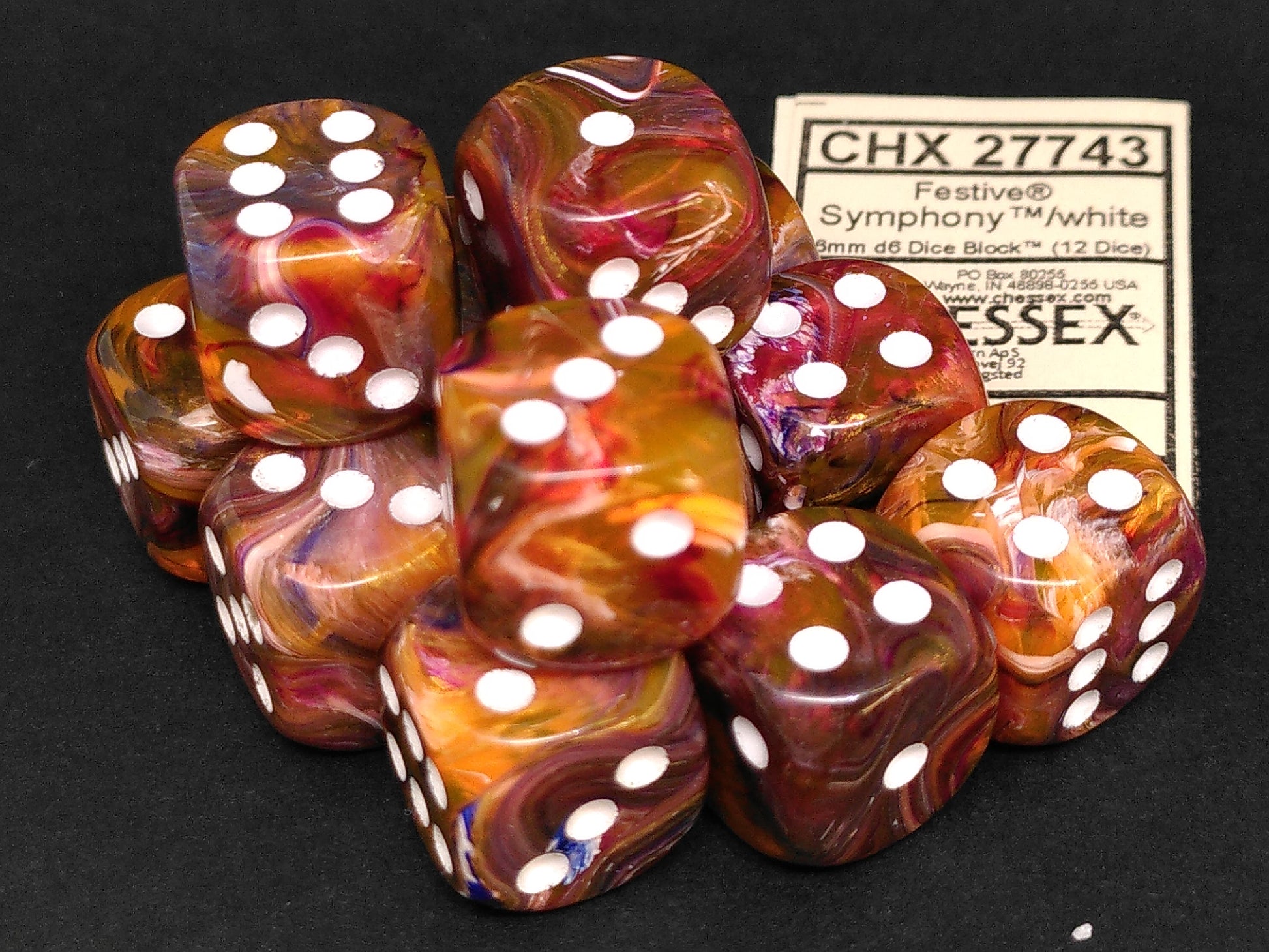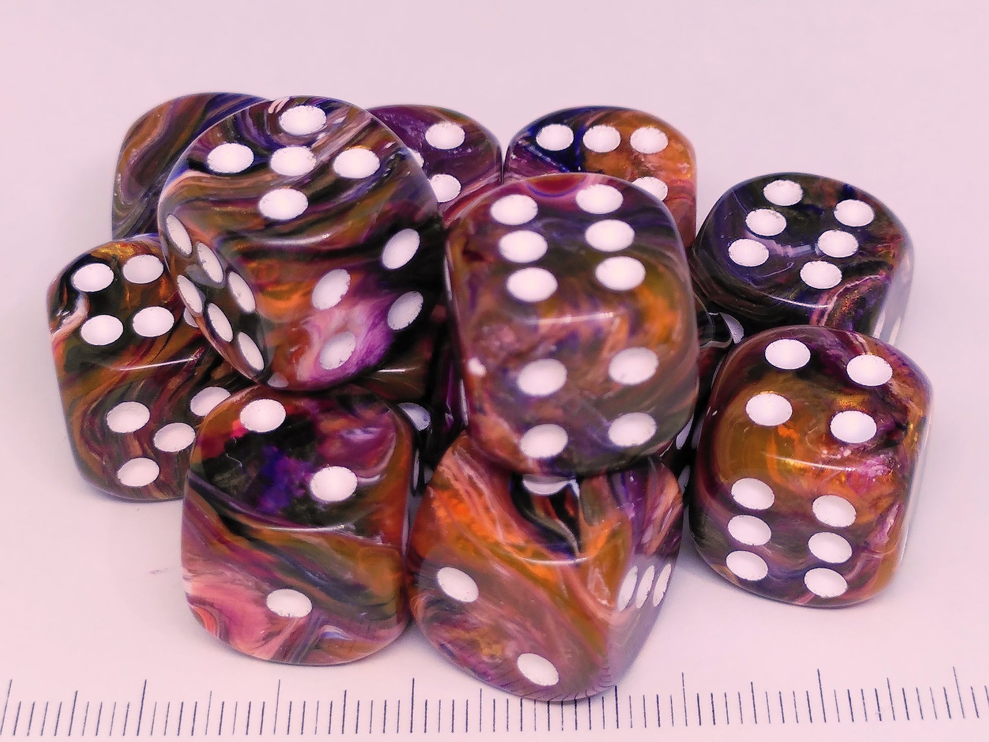Een set van twaalf Chessex zes-zijdige dobbelstenen, semi-transparant met swirls in amberbruin, oranje, paars, blauw en wit. Deze set heeft een witte opdruk.Â