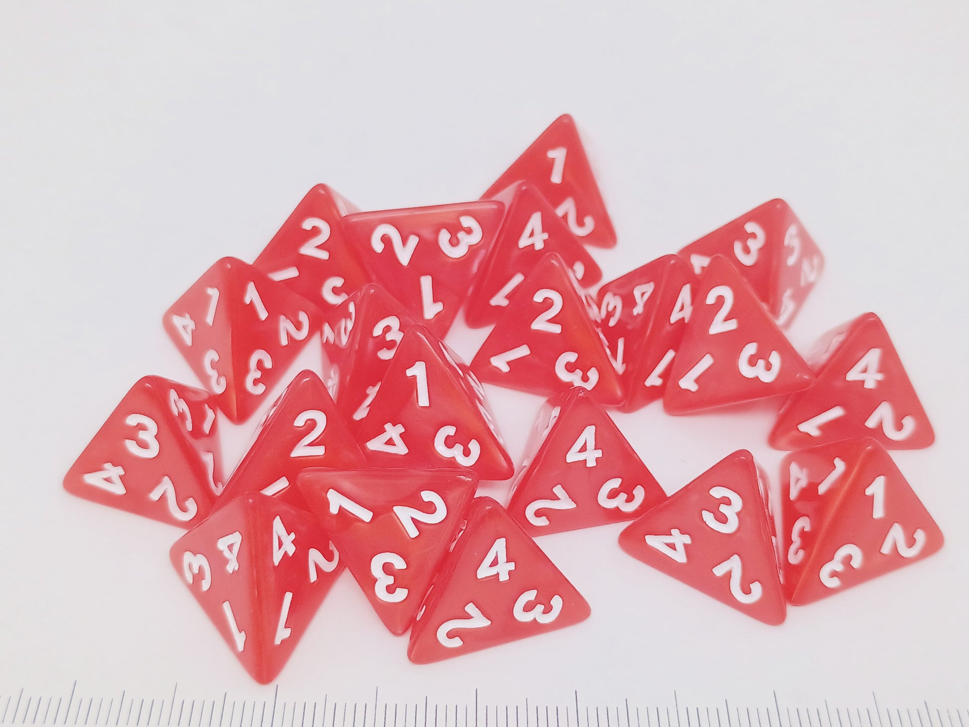 Twintig (20) vierzijdige dobbelsteen, iriserend rood met witte cijfers.