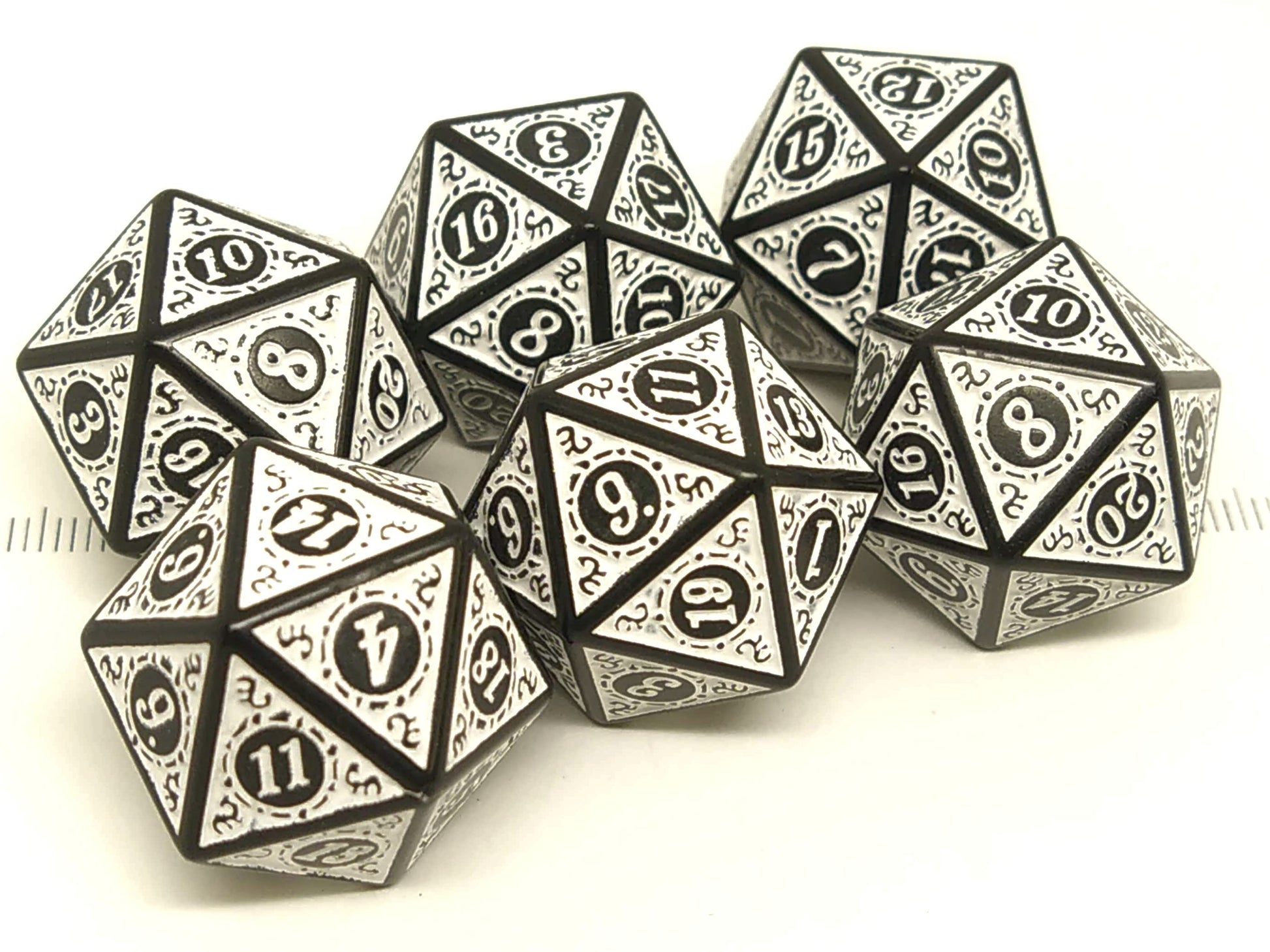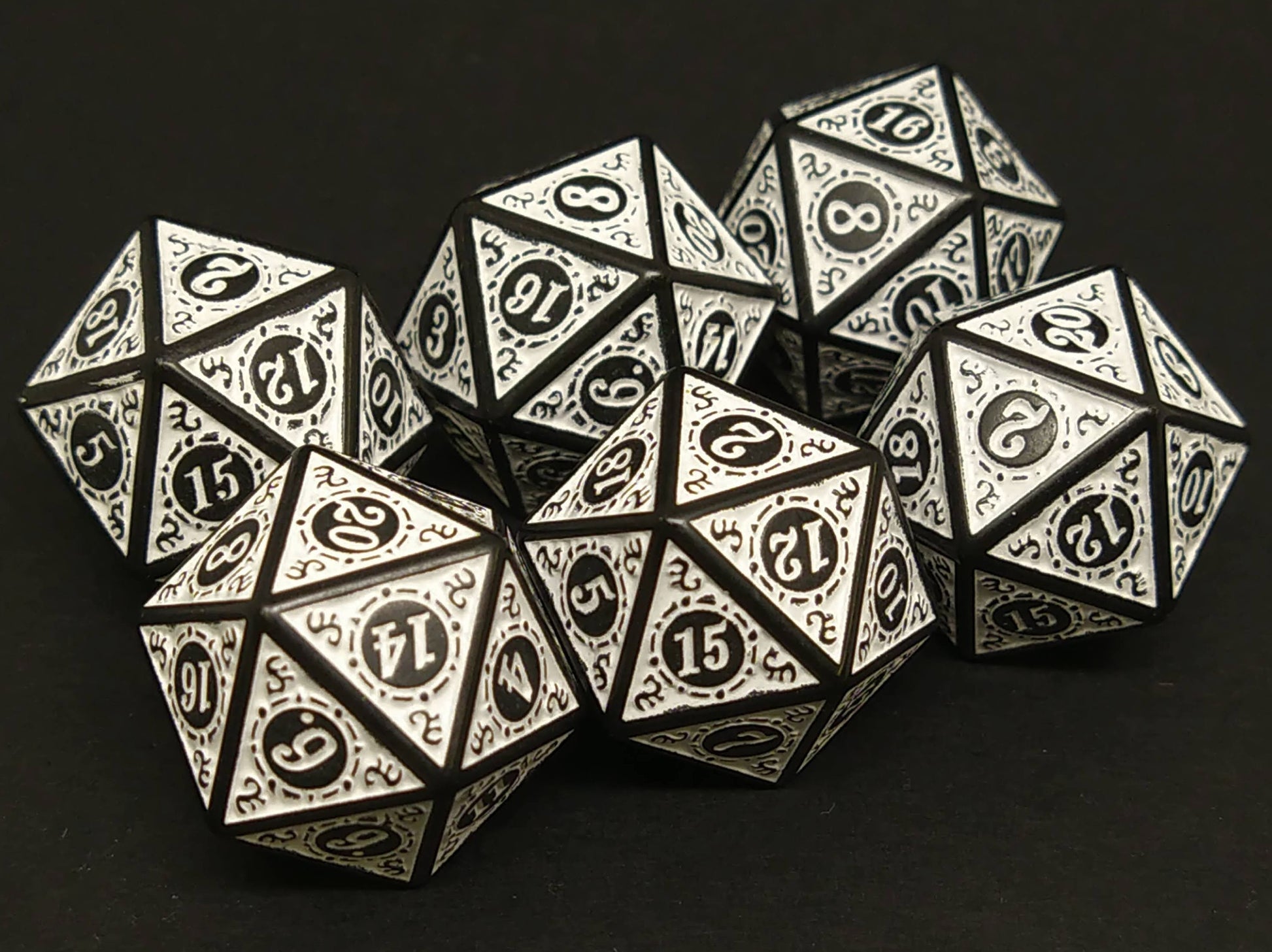 Een set van 6 zwarte 20-zijdige dobbelstenen met witte in relief gedecoreerde vlakken.