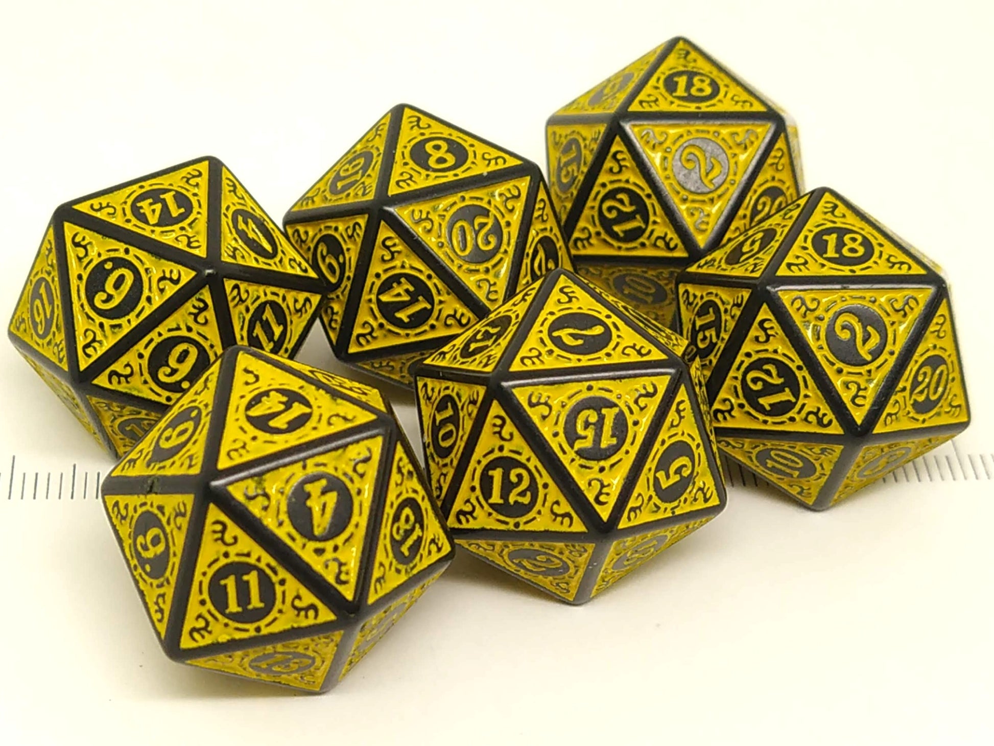 Een set van 6 zwarte 20-zijdige dobbelstenen met gele in relief gedecoreerde vlakken.
