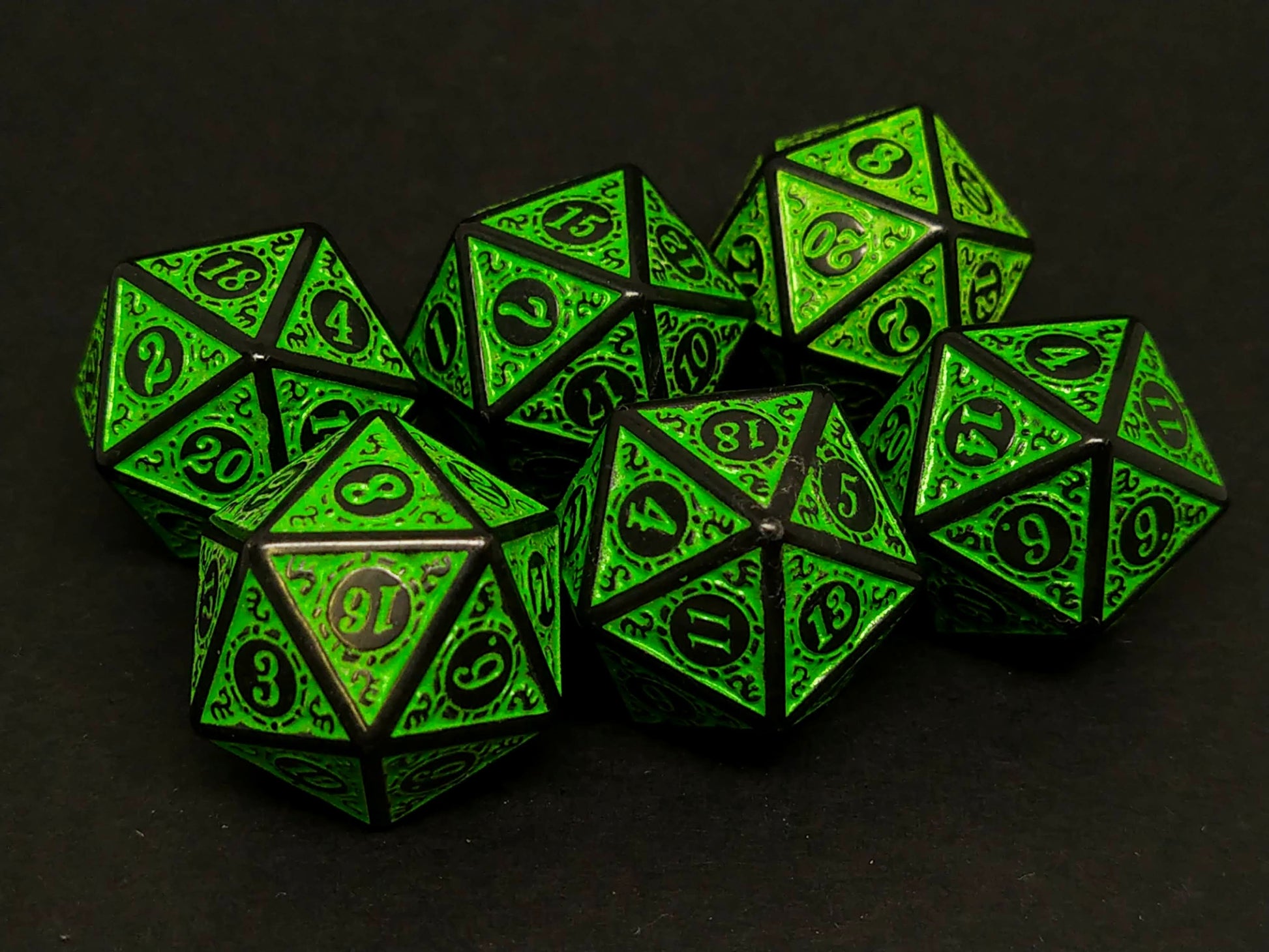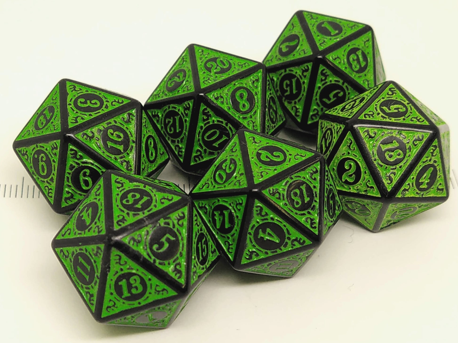 Een set van 6 zwarte 20-zijdige dobbelstenen met groene in relief gedecoreerde vlakken.