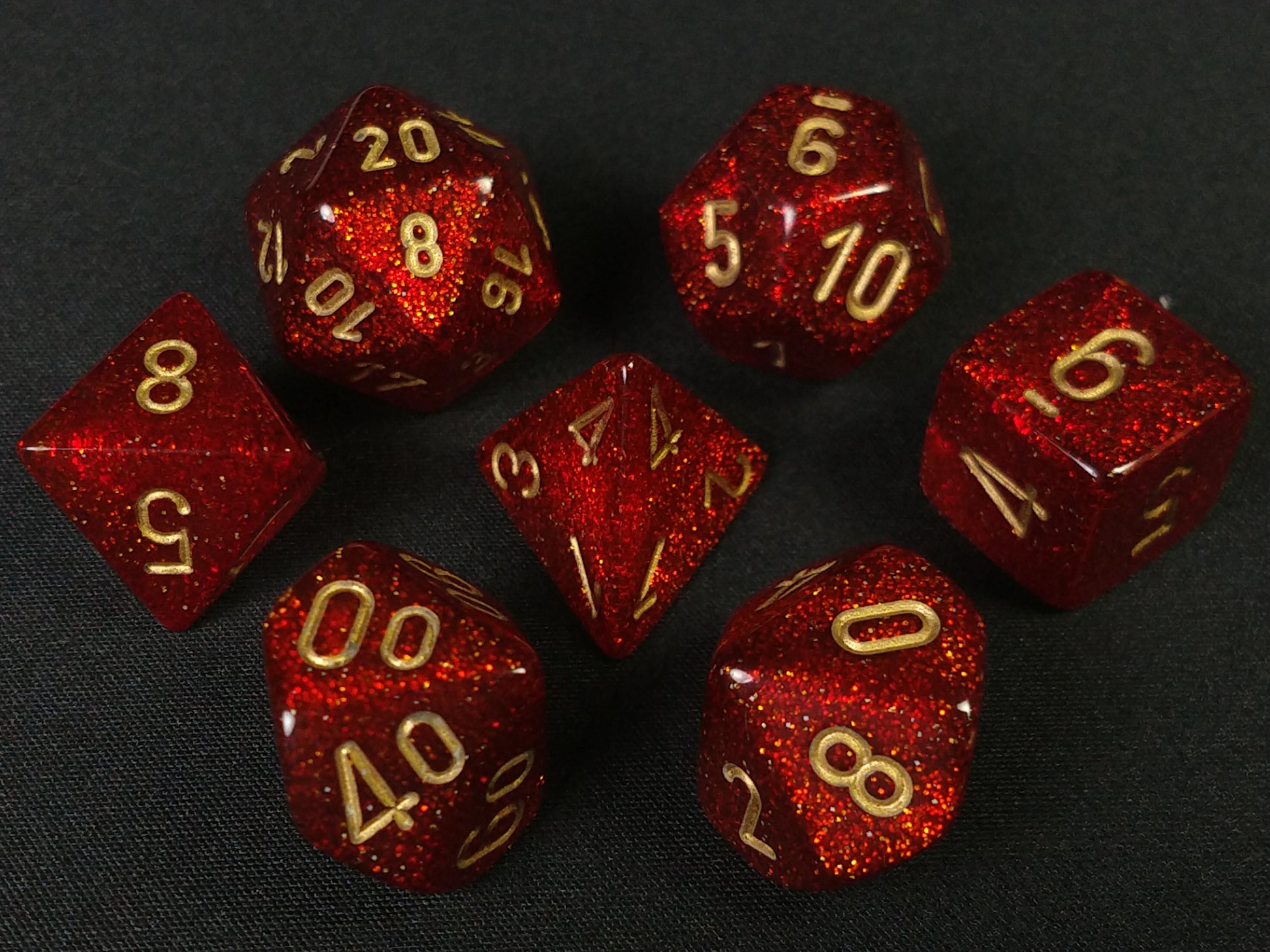Een set van zeven Chessex dobbelstenen in transparant,ondoorzichtig rood met glitters en goudkleurige opdruk.