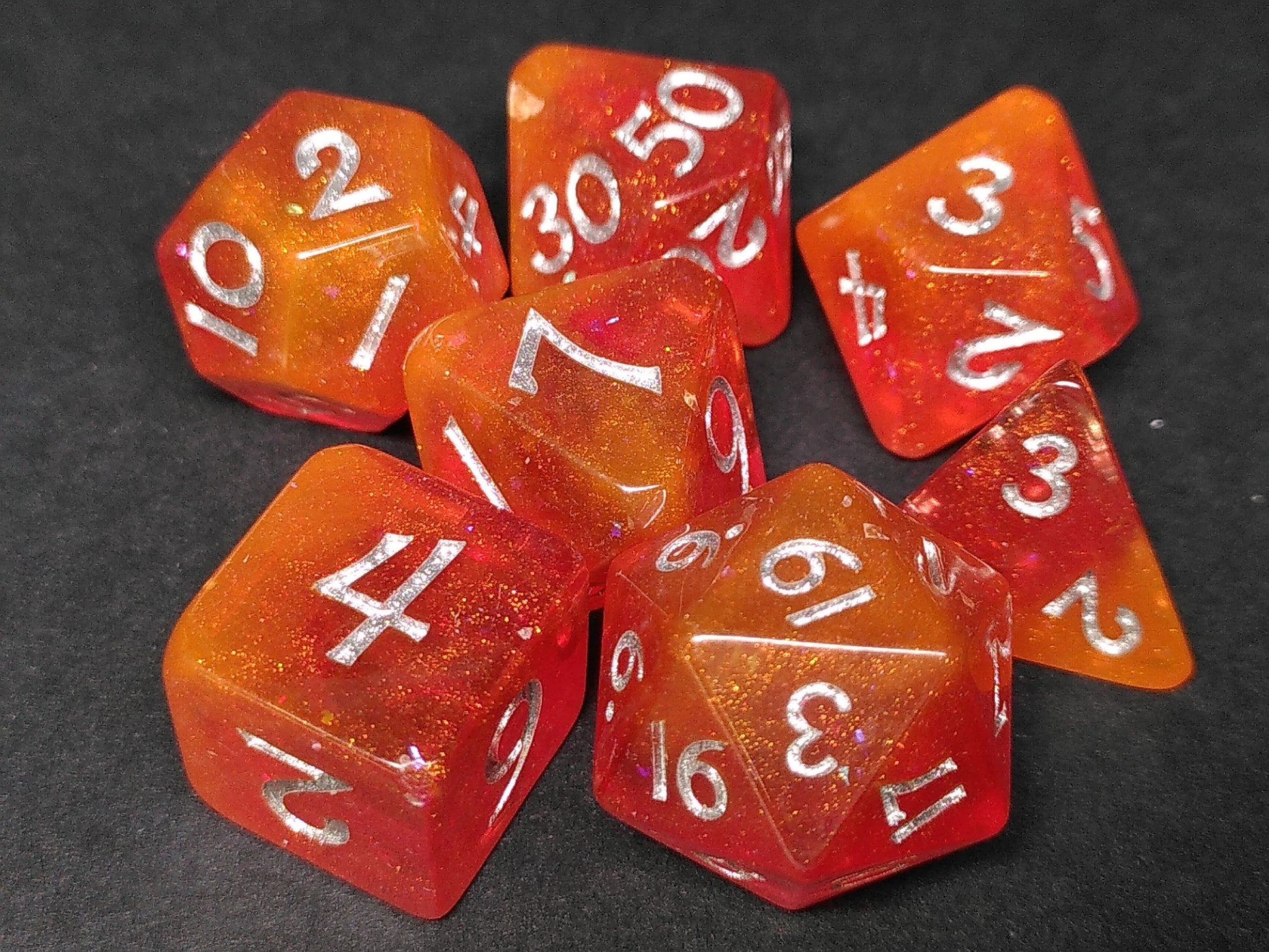 Een set semi-transparante oranje-rode dobbelstenen, met multikleurige glitters en zilverkleurige cijfers.