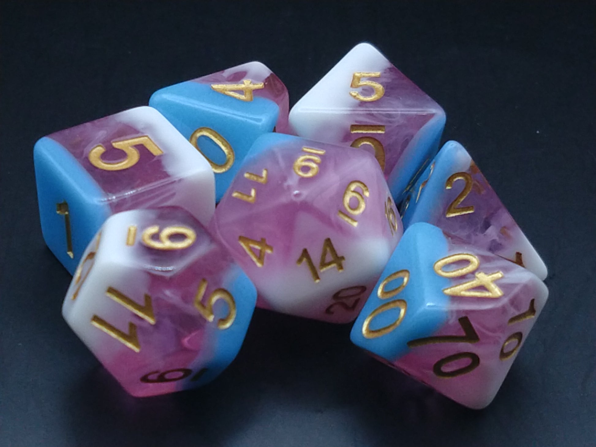 Een set polydice, gevormd in laagjes blauw, transparant paars en romig wit, met goudkleurige cijfers.