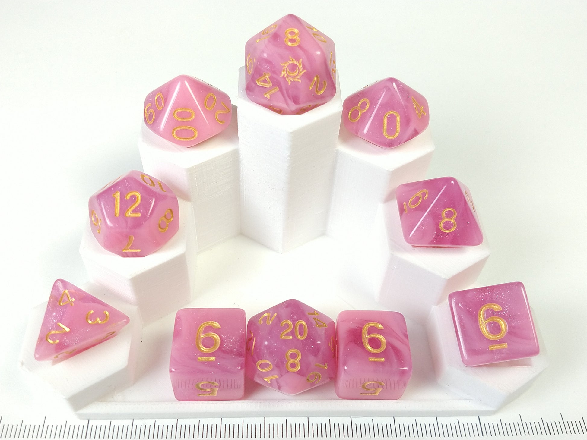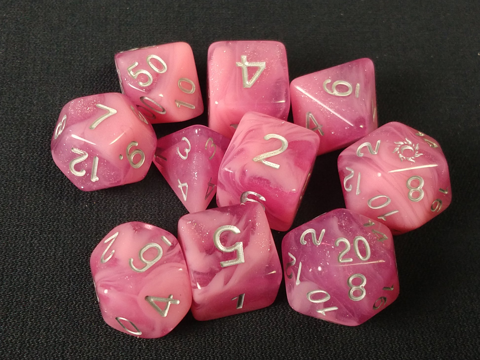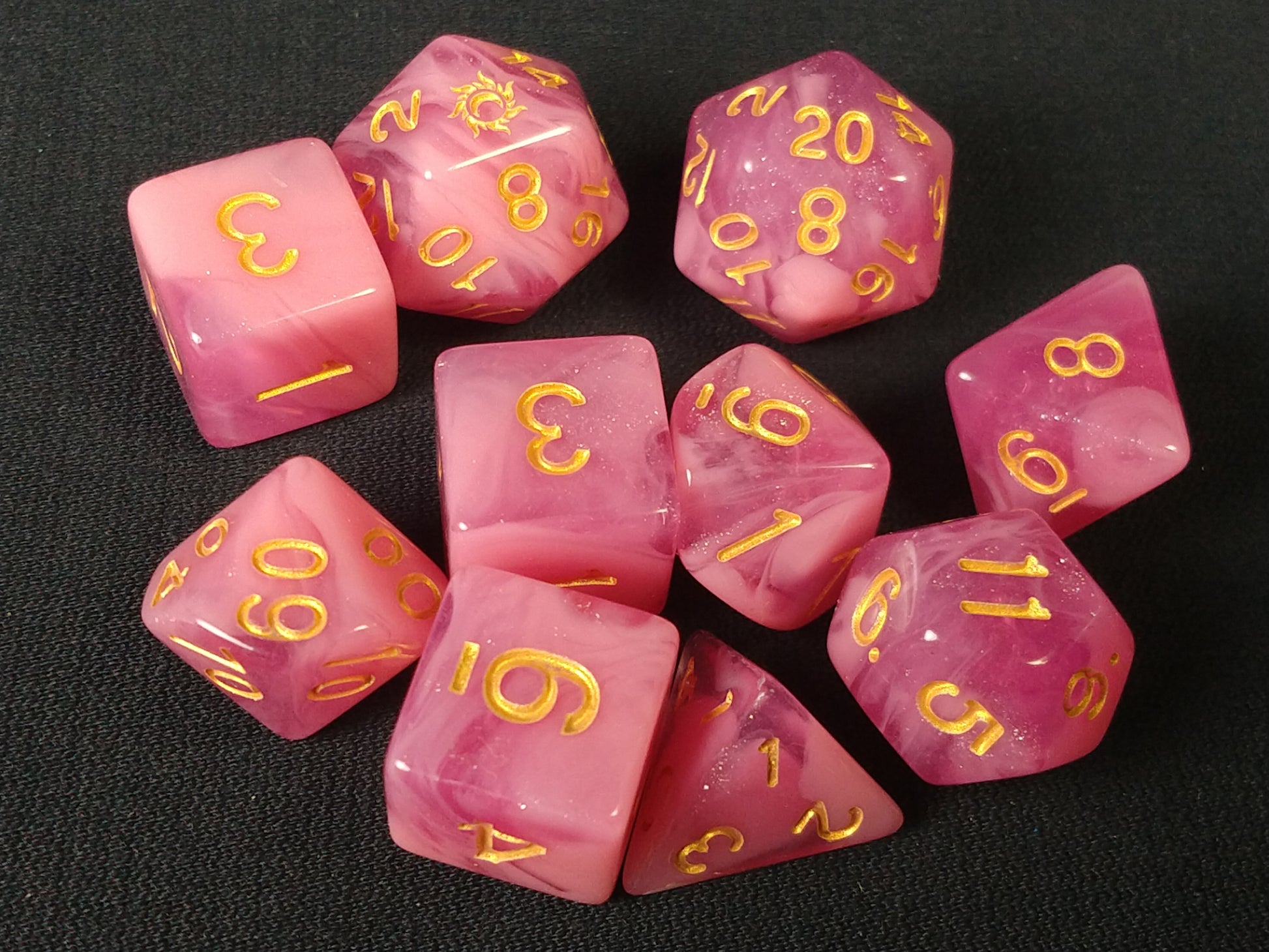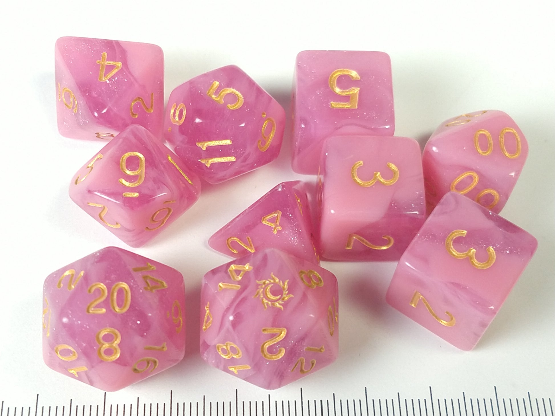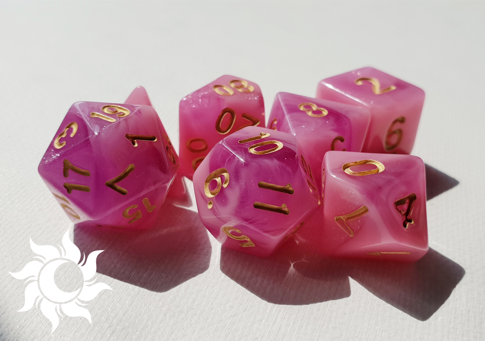 Usagi is a light pink, with darker pink translucent swirl dice set. Available in gold and silver ink options.