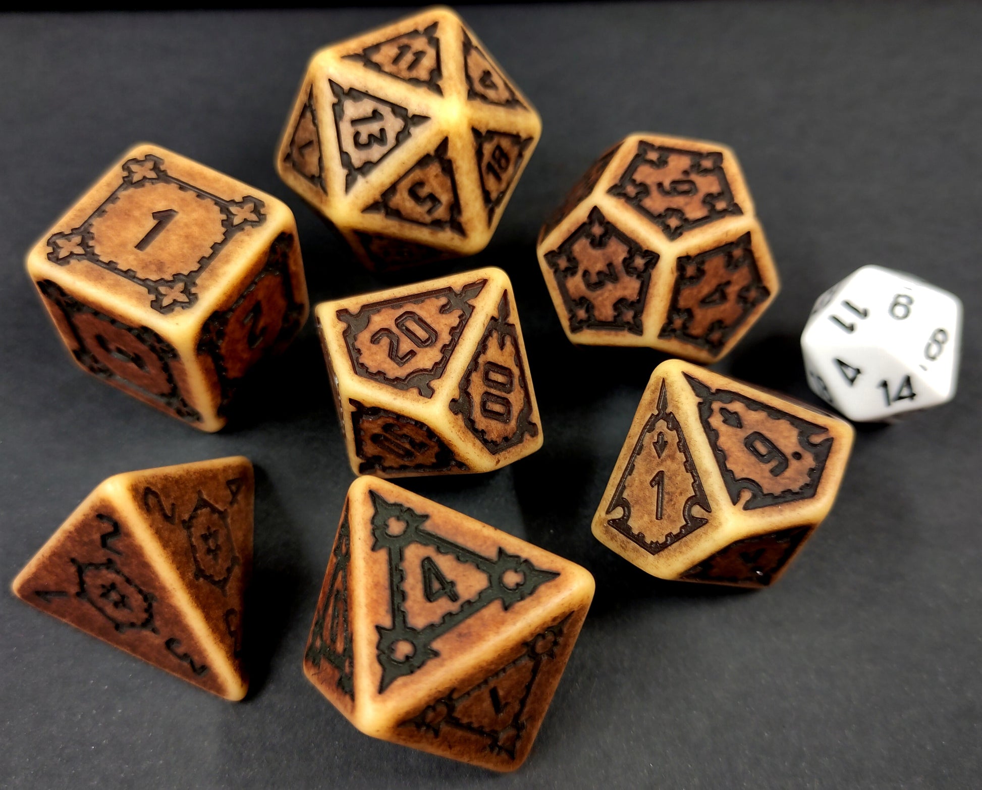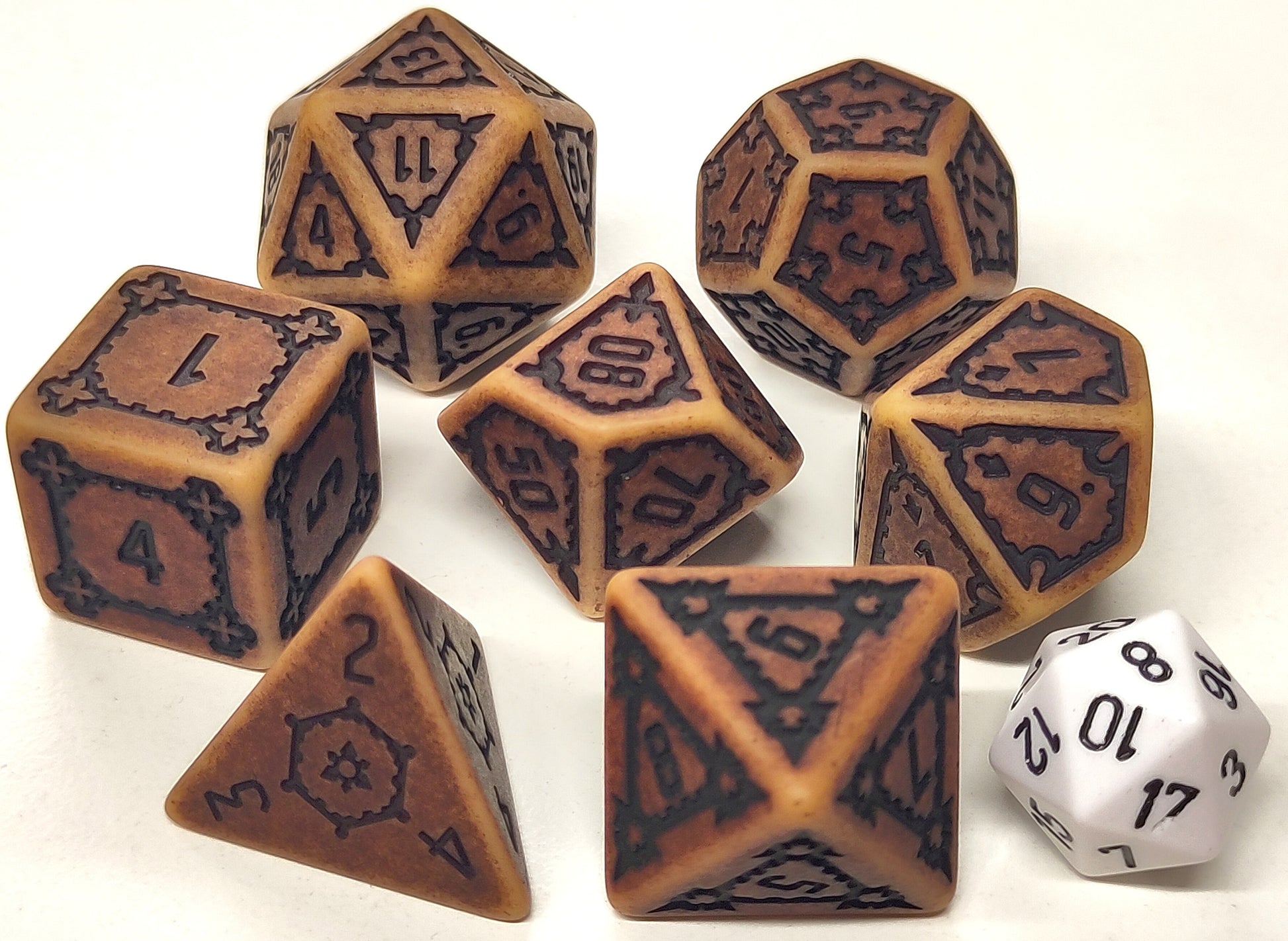 Deze set bevat de zeven meest gangbare dobbelstenen, een van elk: