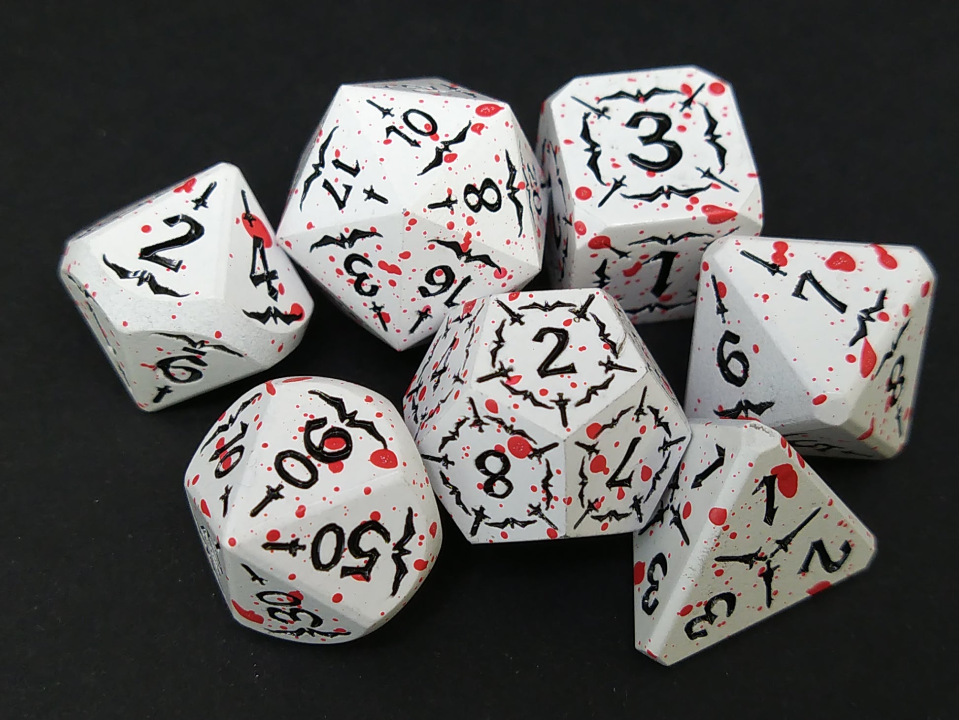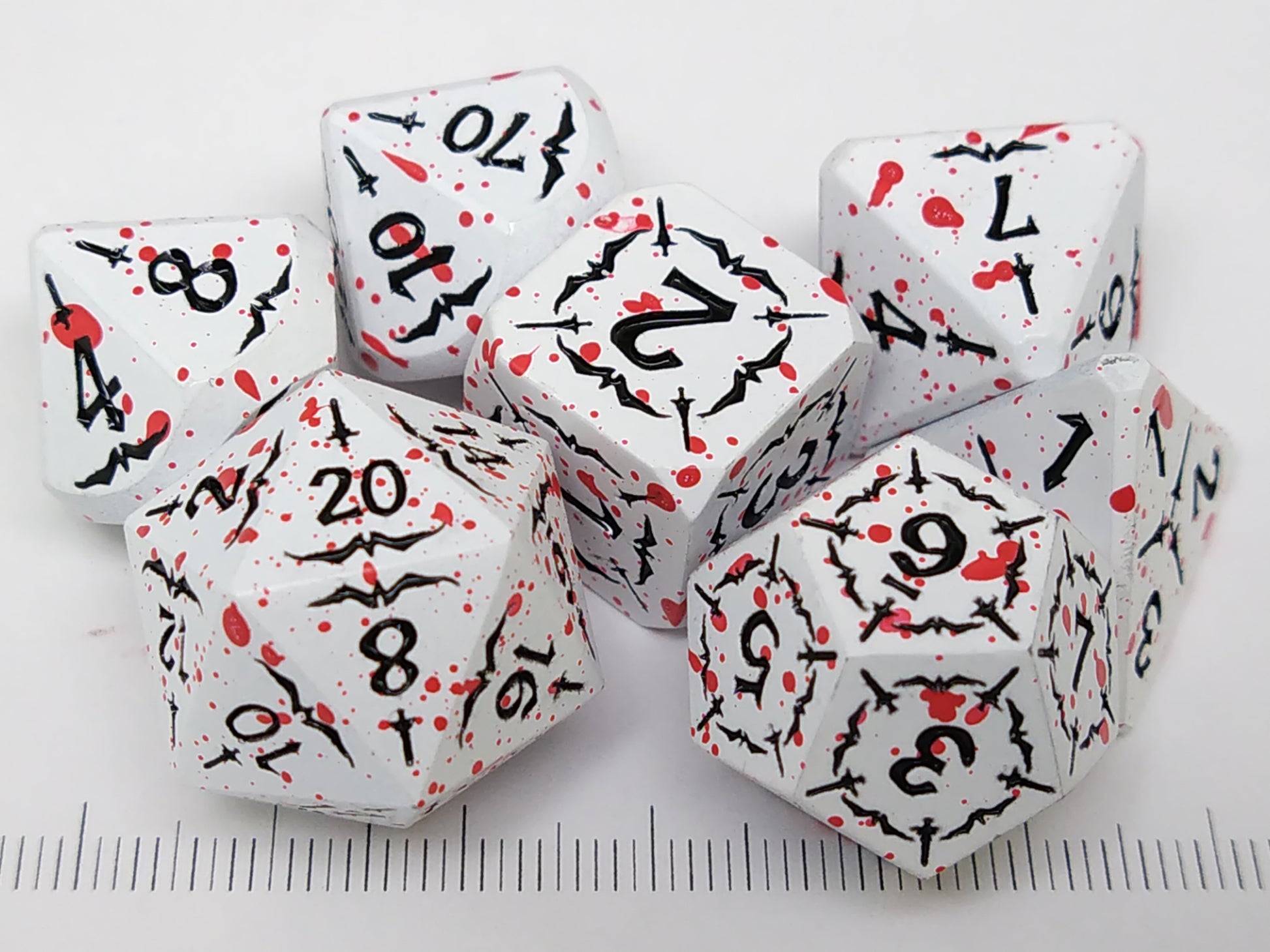 Een set van 7 witte metalen polydice met gegraveerde zwarte cijfers en dolken, met rode spetters.