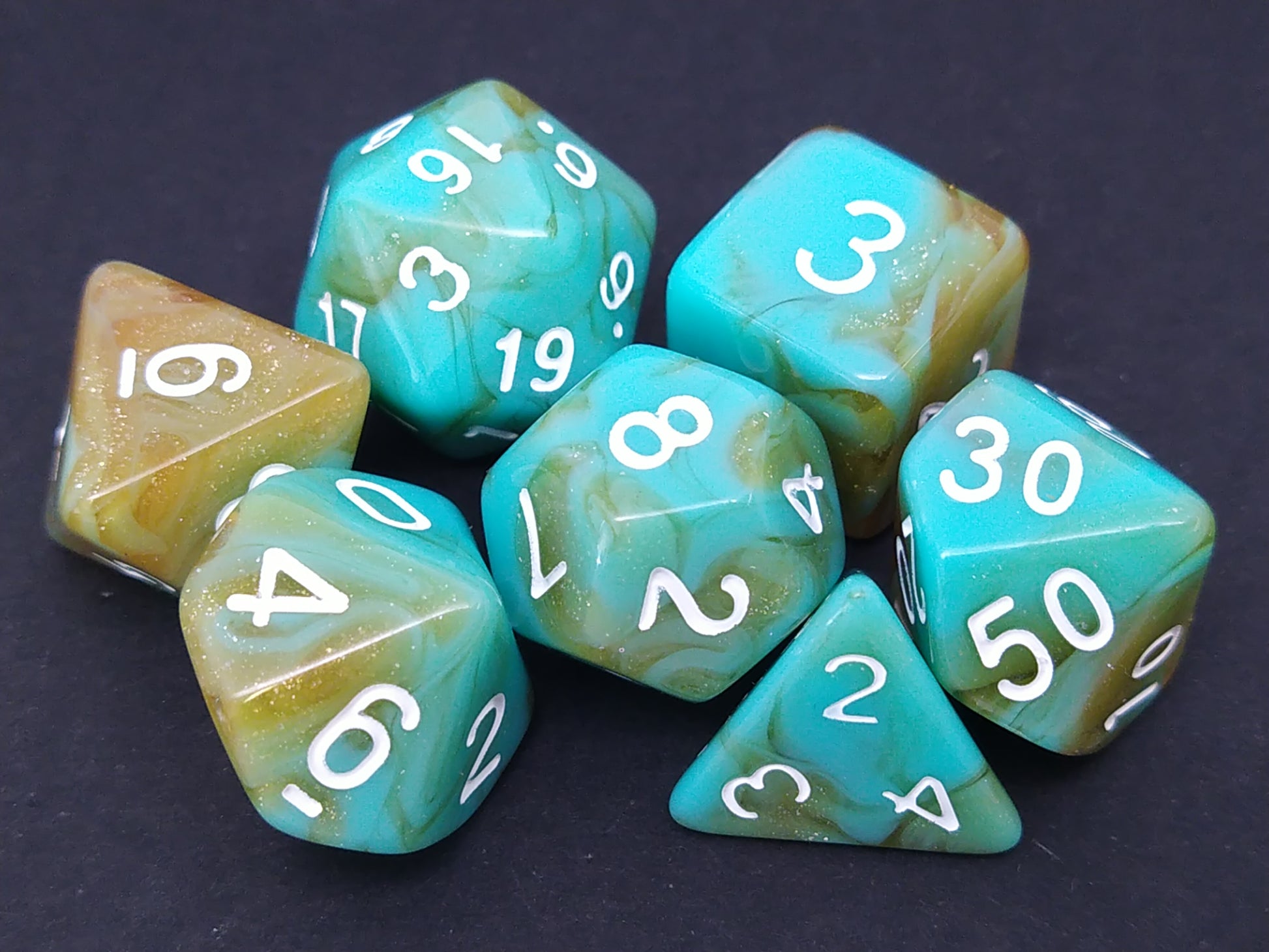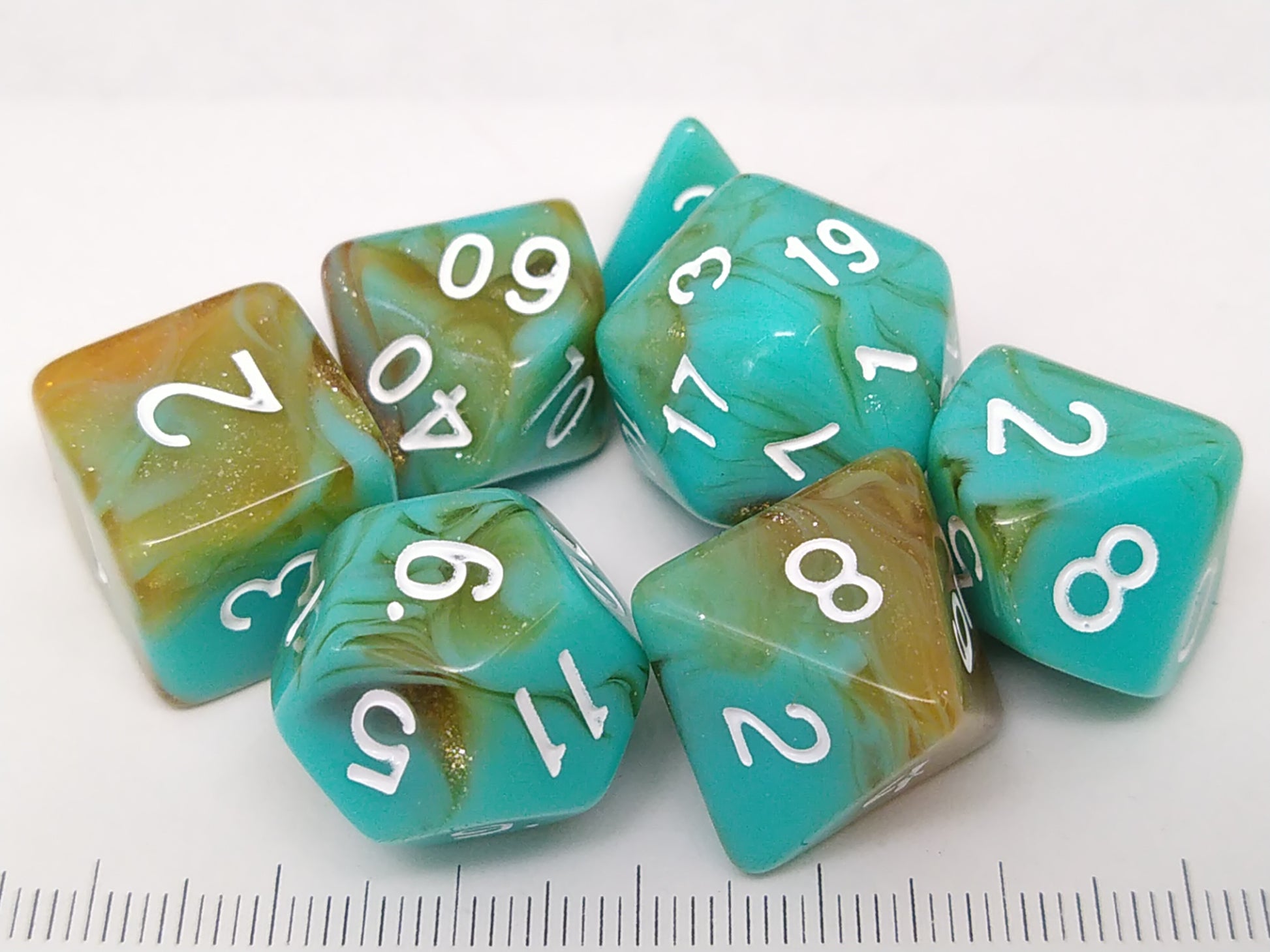Een set polydice, turquoise gemarmerd met glinsterend amberkleur, met witte cijfers.
