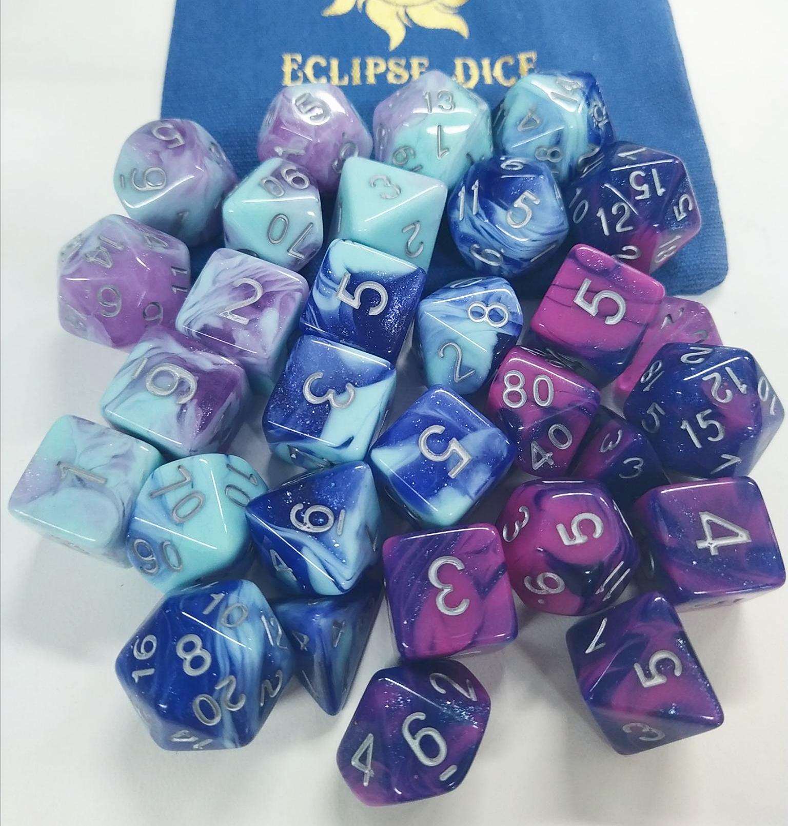 Per set heeft een d20 heeft het Eclipse Dice-logo op de 20, de andere is een standaard d20.