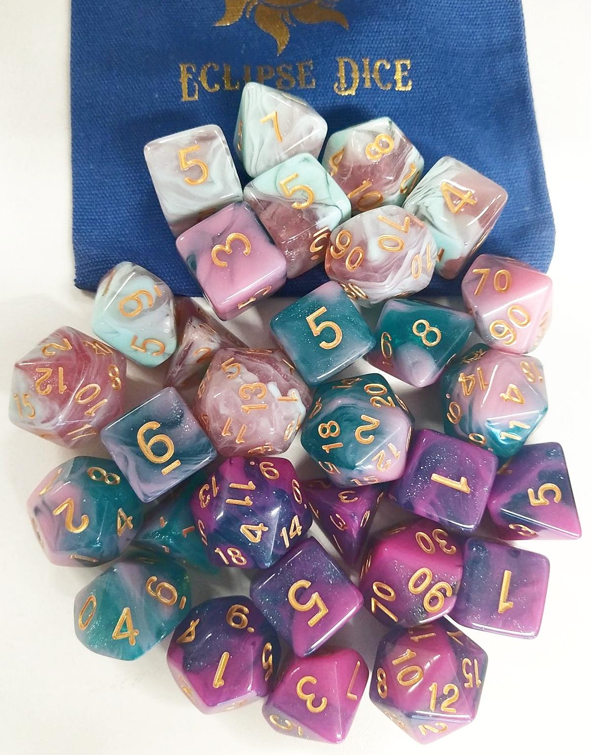 Per set heeft een d20 heeft het Eclipse Dice-logo op de 20, de andere is een standaard d20.