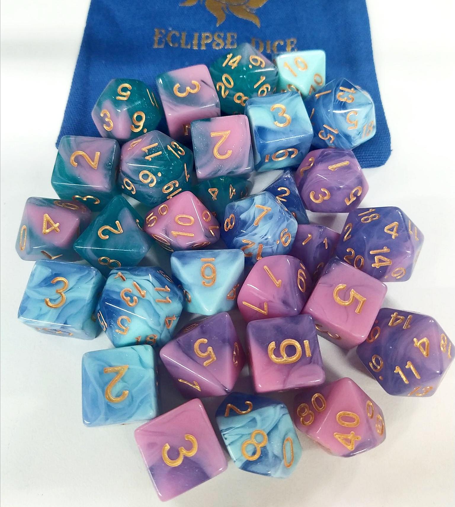 Per set heeft een d20 heeft het Eclipse Dice-logo op de 20, de andere is een standaard d20.