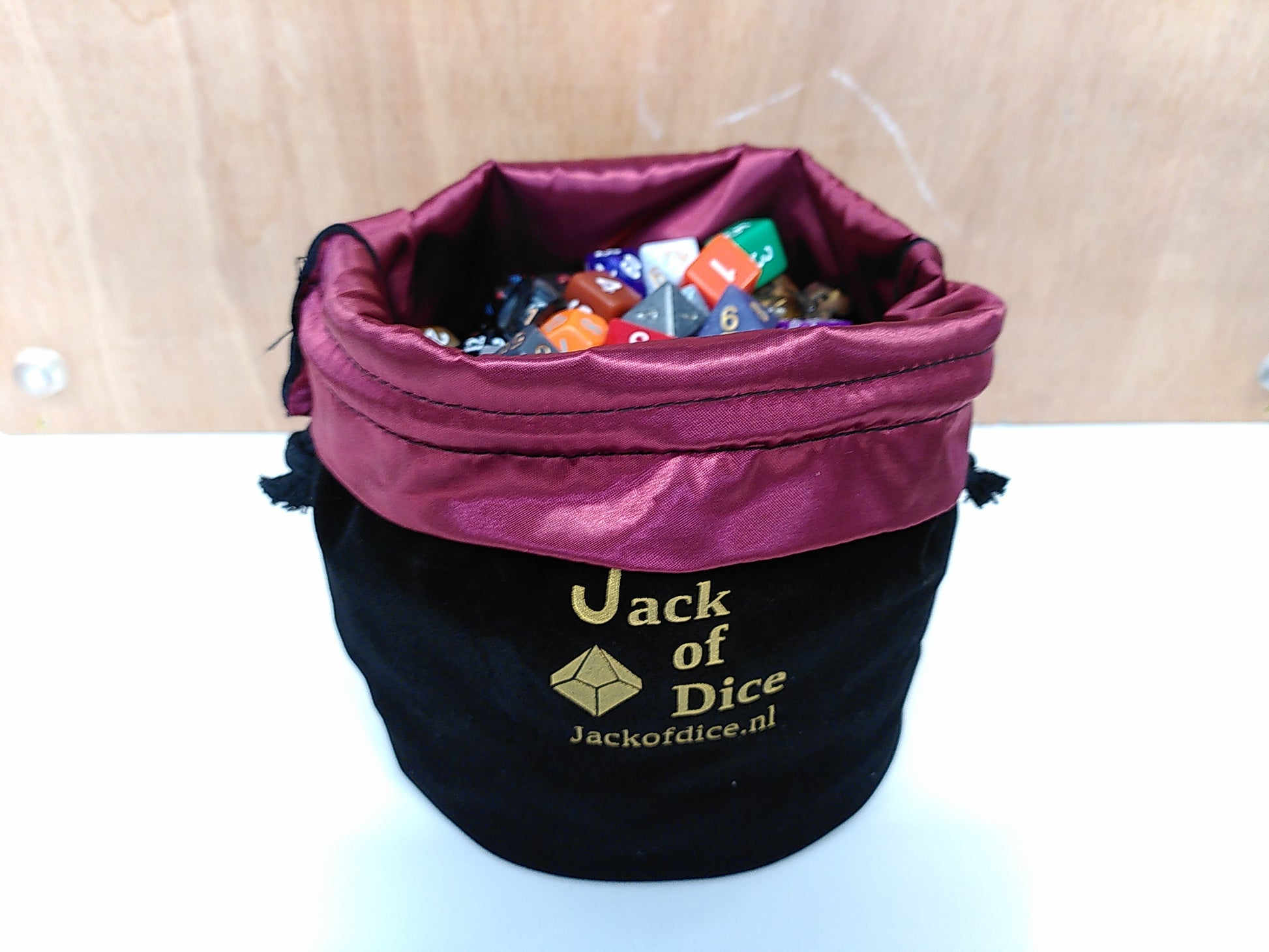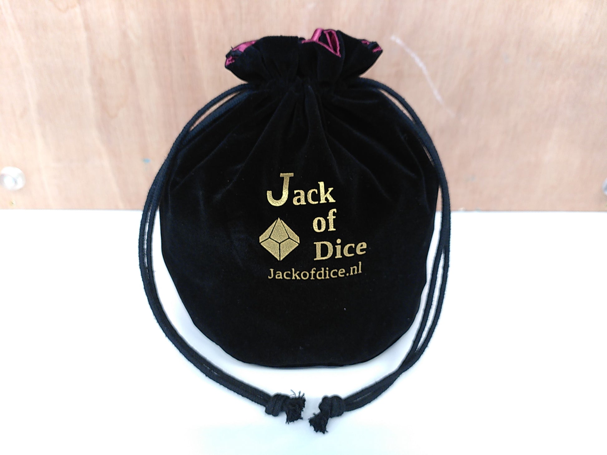 Een zwarte fluwelen buidel gevoerd met donkerrood satijn, die sluit met een katoenen rijgkoord. In deze buidel passen ongeveer 500 standaard polydice.